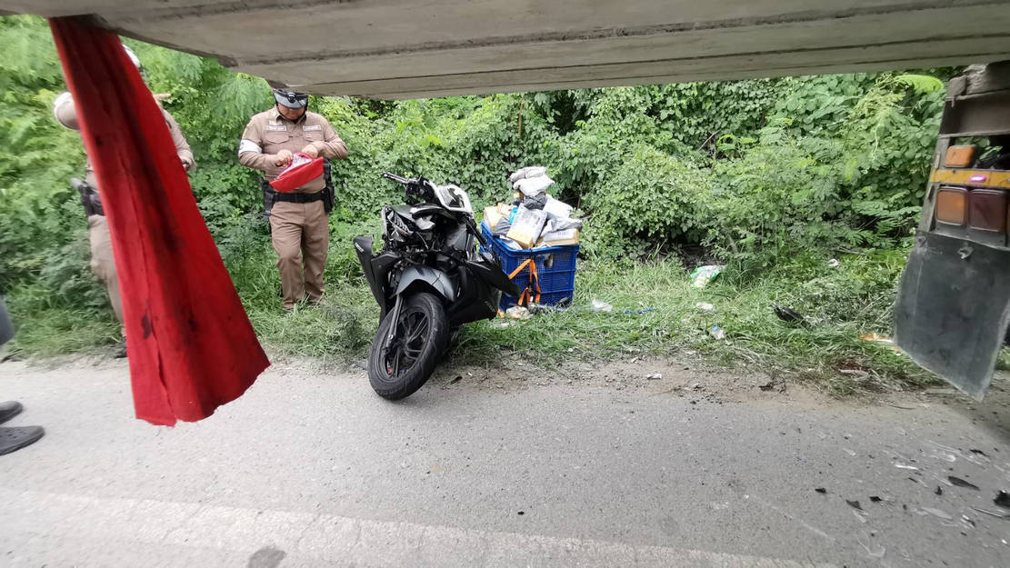 เมื่อถึงที่เกิดเหตุพบรถบรรทุกพ่วง 18 ล้อ ยี่ห้อฮีโน่ สีขาว ทะเบียน นครปฐม จอดชิดไหล่ทางฝั่งขาเข้ามุ่งหน้าไทรน้อย ที่ท้ายรถพบ ผู้บาดเจ็บจำนวน 1 ราย เป็นชายไทย อายุ 26 ปี ได้รับบาดเจ็บสาหัส มีบาดแผลที่บริเวณหน้าผากยาวกว่า 10 ซ.ม.นอนหมดสติอยู่ กู้ภัยนำส่ง รพ.ไทรน้อย ใกล้กันพบรถจักรยานยนต์ ยี่ห้อฮอนด้า รุ่นคลิก สีดำ สภาพใหม่ ไม่ติดแผ่นป้ายทะเบียน ด้านล้อหน้าพังเสียหายยับเยิน กล่องพัสดุที่จะนำไปส่งลูกค้า กระจัดกระจายเต็มพื้นจำนวนมาก โทรศัพท์มือถือแตกละเอียด
