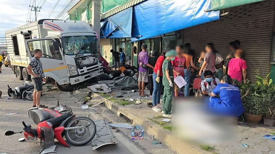 ที่เกิดเหตุ พบรถบรรทุก 10 ล้อ อีซูซุ สีขาว ป้ายทะเบียน 7572 สมุทรสงคราม ลักษณะชนเข้ากับเสาไฟ และรถจักรยานยนต์ที่จอดอยู่ข้างทางได้รับความเสียหายหลายคัน และพบว่ามีผู้ได้รับบาดเจ็บ เป็นชายไทย อายุ 19 ปี และหญิงไทย อายุ 48 ปี ทางอาสาสมัครกู้ภัยฯ ได้ทำการปฐมพยาบาลเบื้องต้นและนำส่ง รพ.อู่ทอง และพบว่ามีผู้เสียชีวิต 1 คน สภาพร่างถูกรถบรรทุกอัดเข้ากับเสาไฟ อาสาฯ จึงดำเนินการนำร่างออกมา ตรวจสอบเอกสารเป็นหญิงไทย อายุ 26 ปี ซึ่งพบว่าวันนี้ตรงกับวันคล้ายวันเกิดของผู้เสียชีวิตด้วย ทำให้ญาติที่มารอรับกลับบ้านต่างร่ำไห้ด้วยความเสียใจ
