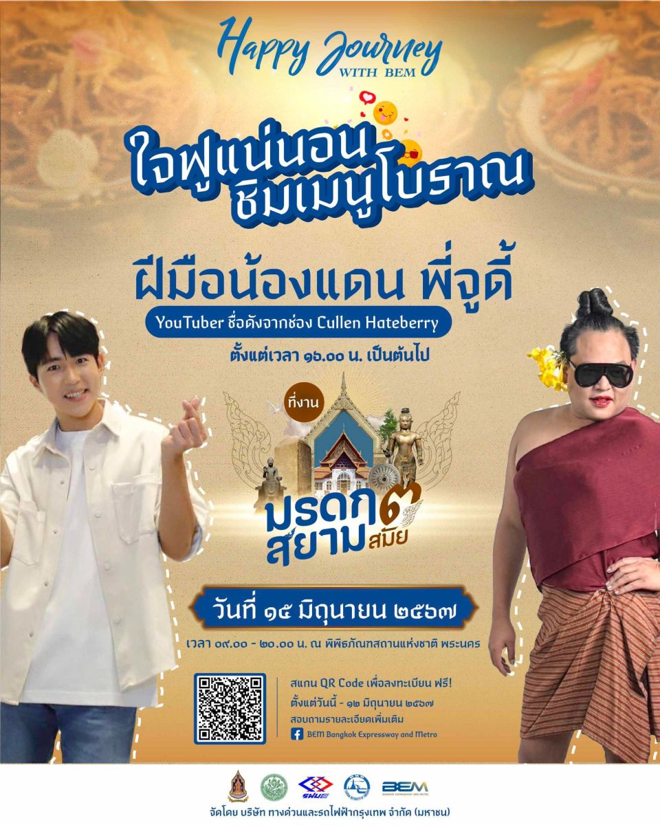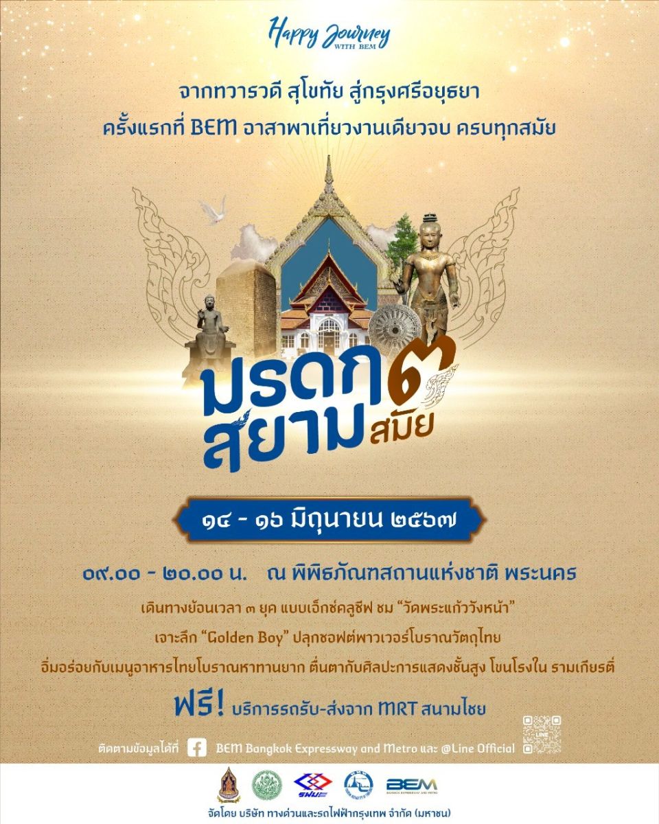 บริษัท ทางด่วนและรถไฟฟ้ากรุงเทพ จำกัด (มหาชน) หรือ BEM สื่อกลางในการเชื่อมโยงผู้คน มาพบกับประสบการณ์ใหม่ๆ ของการค้นหาเรื่องราวน่าสนใจของประวัติศาสตร์ โบราณวัตถุ และวัฒนธรรม จัดกิจกรรม Happy Journey with BEM ตอน มรดกสยาม ๓ สมัย ครั้งแรกกับการพาเที่ยว ครบ จบทั้ง 3 ยุคตั้งแต่สมัยทวารวดี สุโขทัย และกรุงศรีอยุธยา เพลิดเพลินไปกับการเดินทางบนเส้นทางประวัติศาสตร์ รอบกรุงรัตนโกสินทร์
