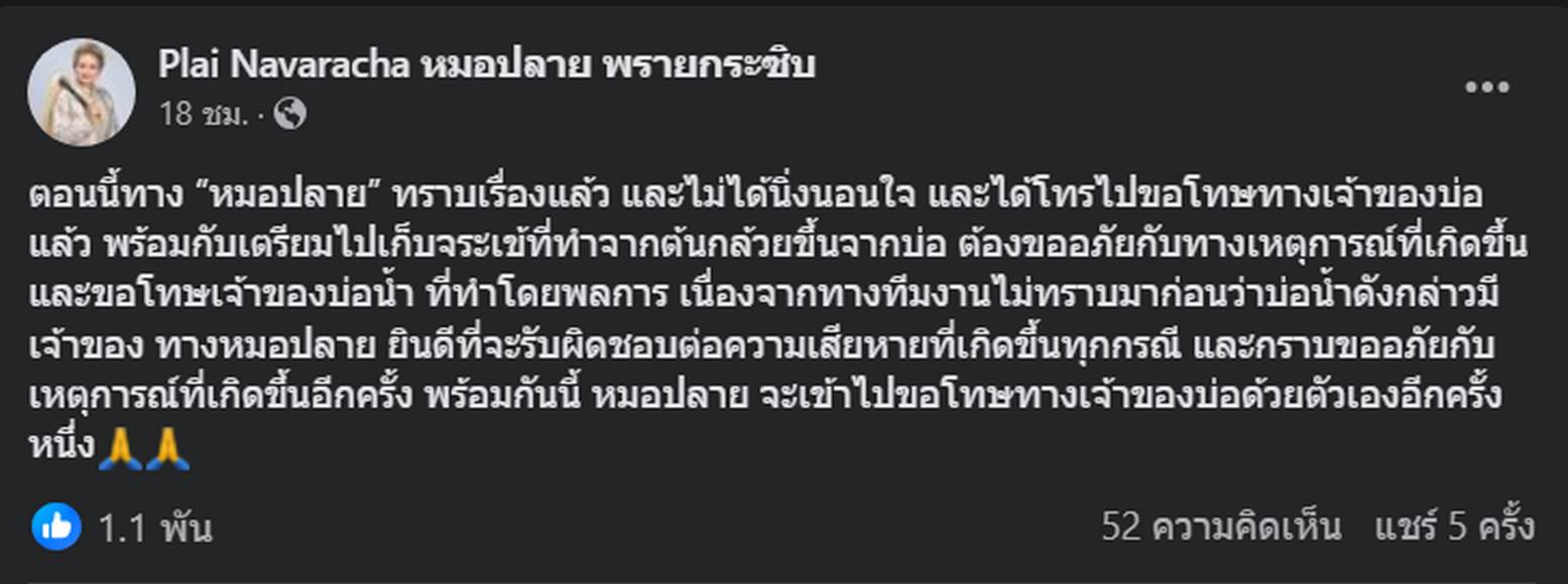 ล่าสุด เพจ Plai Navaracha หมอปลาย พรายกระซิบ โพสต์ข้อความขอโทษหลังทราบเรื่องดังกล่าวด้วยว่า “ตอนนี้ทาง หมอปลาย ทราบเรื่องแล้ว และไม่ได้นิ่งนอนใจ และได้โทรไปขอโทษทางเจ้าของบ่อแล้ว พร้อมกับเตรียมไปเก็บจระเข้ที่ทำจากต้นกล้วยขึ้นจากบ่อ ต้องขออภัยกับทางเหตุการณ์ที่เกิดขึ้น และขอโทษเจ้าของบ่อน้ำ ที่ทำโดยพลการ เนื่องจากทางทีมงานไม่ทราบมาก่อนว่าบ่อน้ำดังกล่าวมีเจ้าของ ทางหมอปลาย ยินดีที่จะรับผิดชอบต่อความเสียหายที่เกิดขึ้นทุกกรณี และกราบขออภัยกับเหตุการณ์ที่เกิดขึ้นอีกครั้ง พร้อมกันนี้ หมอปลาย จะเข้าไปขอโทษทางเจ้าของบ่อด้วยตัวเองอีกครั้งหนึ่ง”