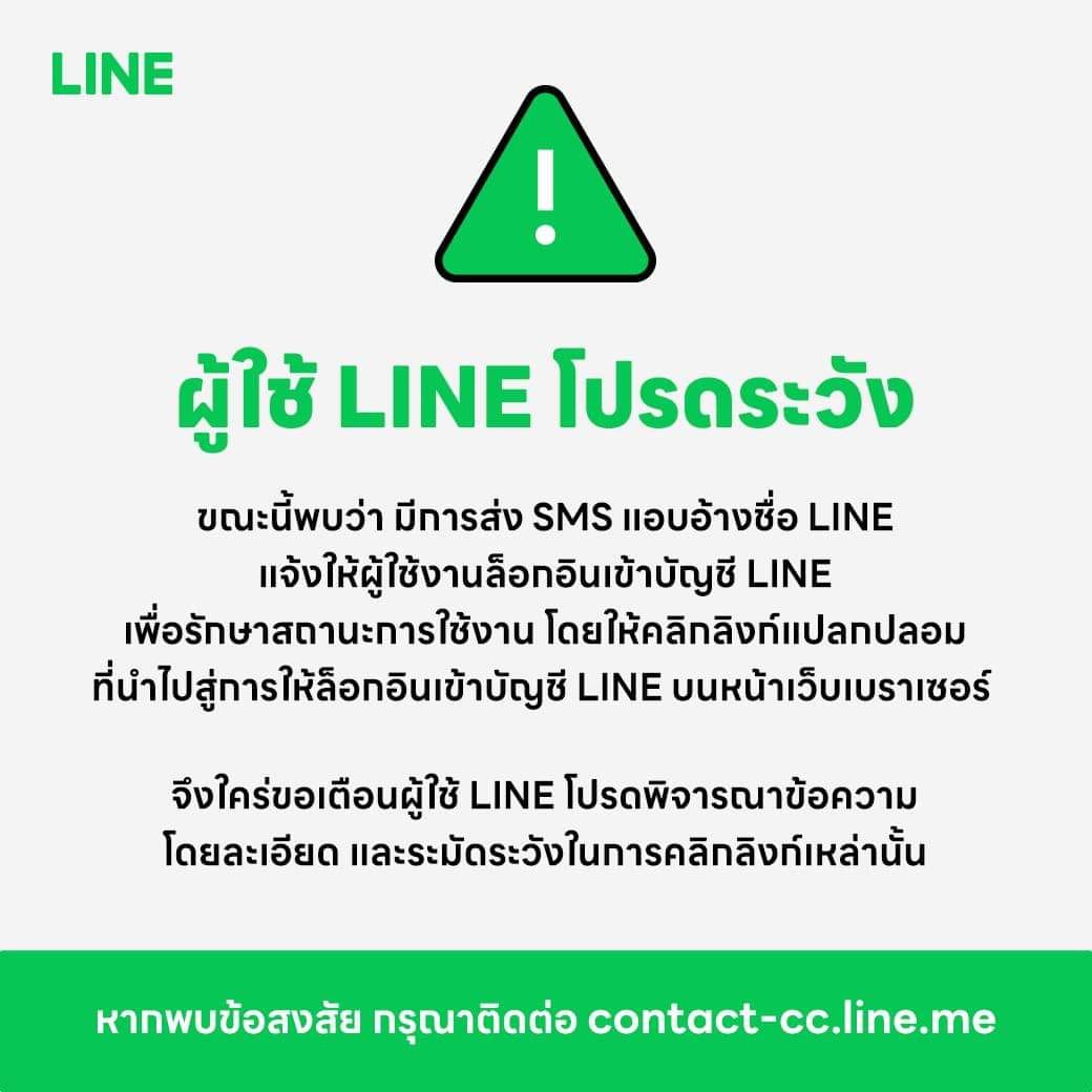Application Line ผู้ใช้ LINE โปรดระวัง ขณะนี้พบว่า มีการส่ง SMS แอบอ้างชื่อ LINE แจ้งให้ผู้ใช้งานล็อกอินเข้าบัญชี LINE เพื่อรักษาสถานะการใช้งาน โดยให้คลิกลิงก์แปลกปลอม ที่นำไปสู่การให้ล็อกอินเข้าบัญชี LINE บนหน้าเว็บเบราเซอร์ จึงใคร่ขอเตือนผู้ใช้ LINE โปรดพิจารณาข้อความโดยละเอียดและระมัดระวังในการคลิกลิงก์เหล่านั้น หากพบข้อสงสัย กรุณาติดต่อ contact-cc.line.me