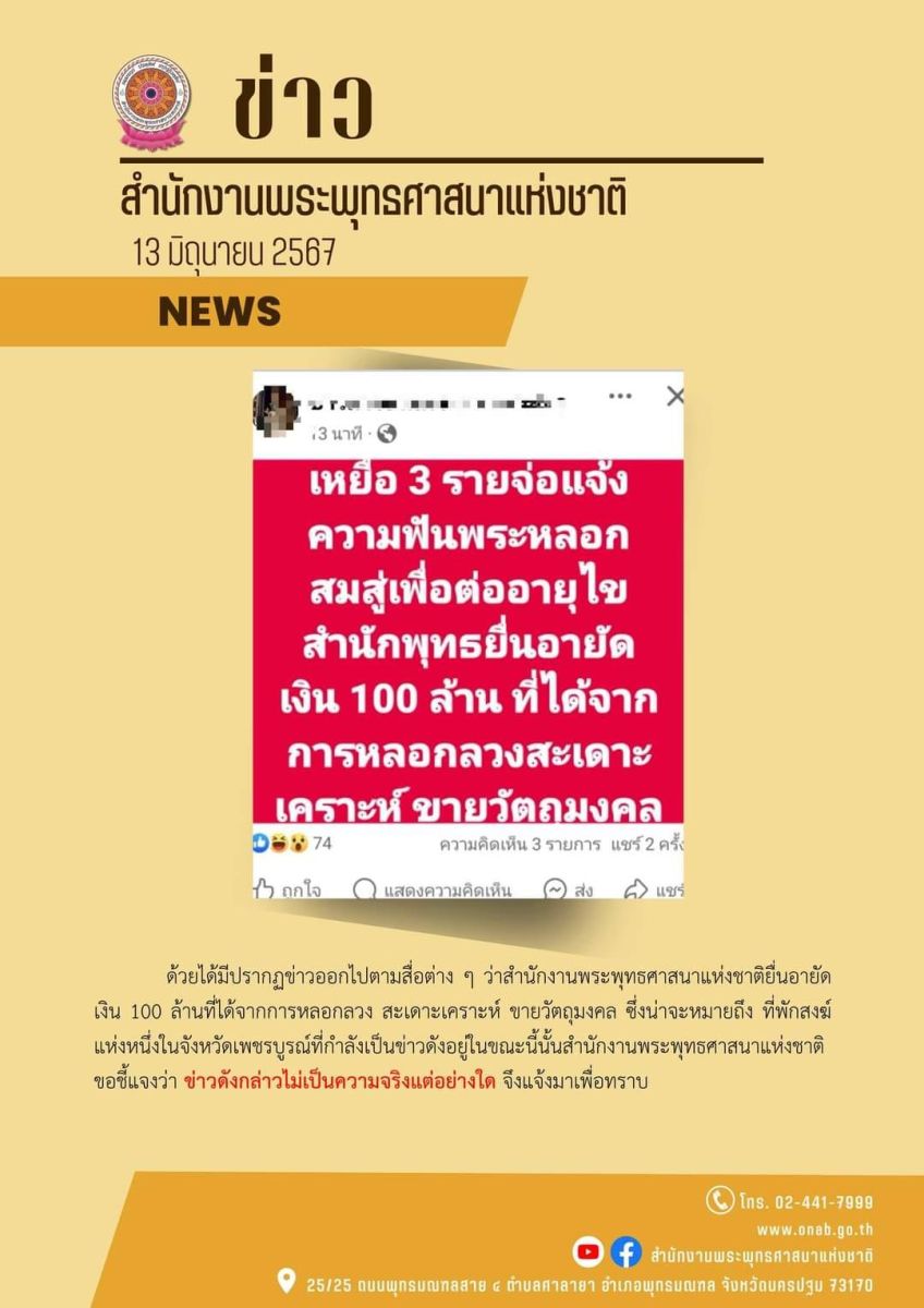 ล่าสุดเพจ “สำนักงานพระพุทธศาสนาแห่งชาติ” โพสต์ภาพและข้อความชี้แจงว่าสำนักงานพระพุทธศาสนาแห่งชาติยื่นอายัดเงิน 100 ล้าน ที่ได้จากการหลอกลวง สะเดาะเคราะห์ ขายวัตถุมงคล
