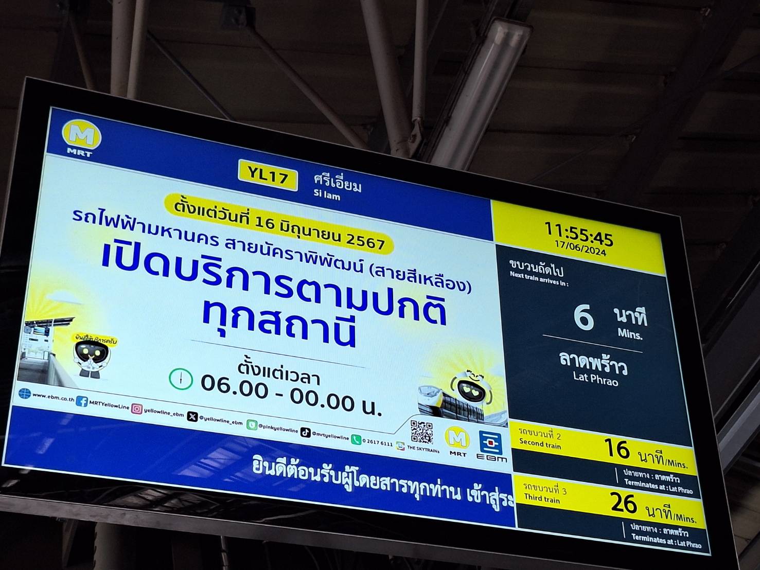 17 มิถุนายน 2567 บริษัท อีสเทิร์น บางกอกโมโนเรล จำกัด (EBM) ผู้ให้บริการรถไฟฟ้ามหานคร สายนัคราพิพัฒน์ (สายสีเหลือง) ช่วงลาดพร้าว – สำโรง เปิดให้บริการเต็มระบบ หลังซ่อมแซมระบบการเดินรถช่วงสถานีกลันตัน (YL12) - สถานีศรีอุดม (YL16) ดำเนินการแล้วเสร็จ