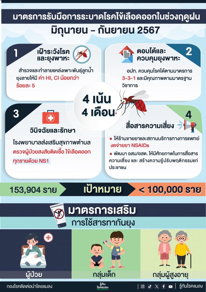 เมื่อวันที่ 11 มิถุนายน 2567 ที่ผ่านมา กระทรวงสาธารณสุขจัดการประชุมสำนักงานปลัดกระทรวงสาธารณสุขส่วนกลางและส่วนภูมิภาคนอกสถานที่ ครั้งที่ 3/2567 ณ มหาวิทยาลัยราชภัฏนครศรีธรรมราช จังหวัดนครศรีธรรมราช โดยมีนายแพทย์โอภาส การย์กวินพงศ์ ปลัดกระทรวงสาธารณสุข เป็นประธานการประชุม ซึ่งนายแพทย์ธงชัย กีรติหัตถยากร อธิบดีกรมควบคุมโรค ได้มอบหมายให้ นายแพทย์นิติ เหตานุรักษ์ รองอธิบดีกรมควบคุมโรค เข้าร่วมประชุมและเสนอมาตรการรับมือการระบาดของโรคไข้เลือดออกในช่วงฤดูฝน โดยเสนอสถานการณ์โรคไข้เลือดออกปี 2567 ซึ่งมีการคาดการณ์จำนวนผู้ป่วยโรคไข้เลือดออกในเดือนมิถุนายน - กันยายน อาจมีจำนวนผู้ป่วยสูงกว่า 153,000 ราย พร้อมทั้งเสนอมาตรการ “4 เน้น 4 เดือน” เพื่อลดจำนวนผู้ป่วยในช่วงดังกล่าวให้ต่ำกว่าค่าคาดการณ์ 30% ได้แก่ 1) เน้นการเฝ้าระวังโรคและยุงพาหะ โดยการสำรวจและทำลายแหล่งเพาะพันธุ์ลูกน้ำยุงลายให้มีค่าดัชนีลูกน้ำยุงลายต่ำกว่าร้อยละ 5 2) เน้นการตอบโต้ และควบคุมยุงพาหะ โดยหน่วยงานสาธารณสุขร่วมกับองค์กรปกครองส่วนท้องถิ่นควบคุมโรคไข้เลือดออกให้มีคุณภาพตามมาตรฐานวิชาการ 3) เน้นการวินิจฉัยและรักษาที่รวดเร็ว โดยผู้ป่วยสงสัยติดเชื้อไข้เลือดออกทุกรายควรได้รับการคัดกรองตรวจวินิจฉัยด้วยชุดตรวจไข้เลือดออกแบบรวดเร็ว (NS1 rapid test) ในหน่วยบริการปฐมภูมิ 4) เน้นการสื่อสารความเสี่ยง ให้ร้านขายยาและสถานบริการทางการแพทย์งดจ่ายยากลุ่ม NSAIDs ให้แก่ผู้ป่วยที่มีอาการเข้าได้กับโรคไข้เลือดออก เพราะยากลุ่มนี้ทำให้เกิดการระคายเคืองกับกระเพาะอาหาร อาจทำให้เลือดออกได้ และยังทำให้เกล็ดเลือดไม่แข็งตัวอาจทำให้เลือดออกมากขึ้น
