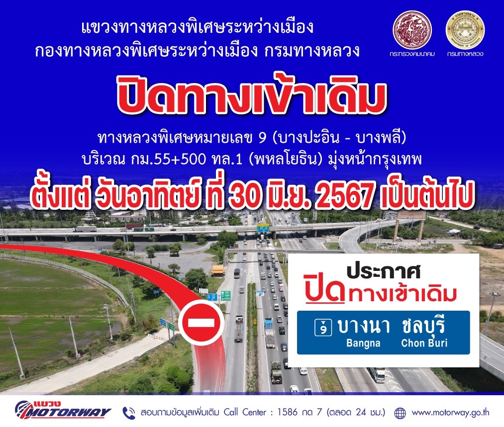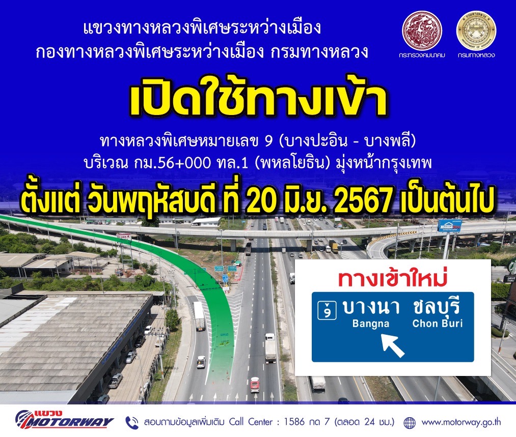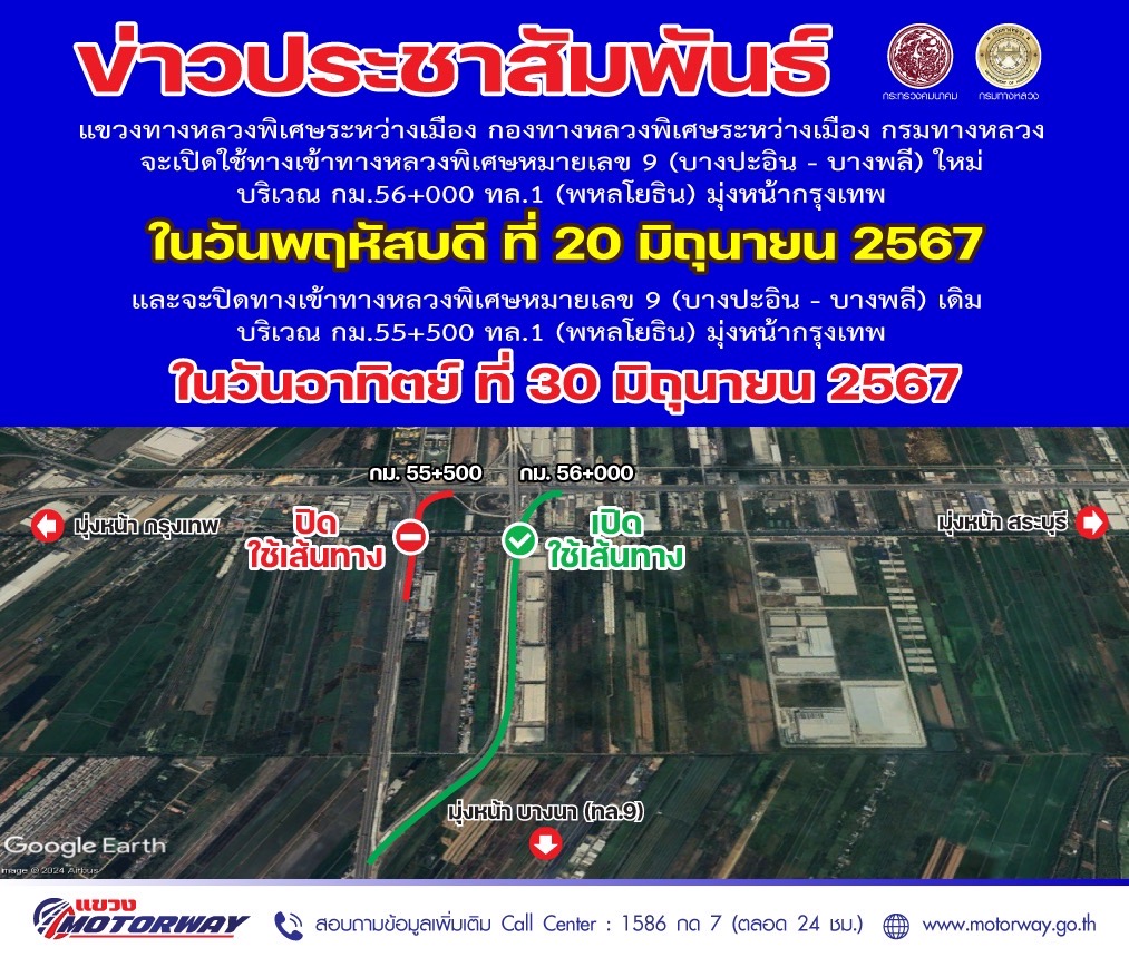 จะเปิดใช้ทางเข้าทางหลวงพิเศษหมายเลข 9 (บางปะอิน - บางพลี) ใหม่บริเวณกม.56+000 ทล.1 (พหลโยธิน) มุ่งหน้ากรุงเทพ ในวันพฤหัสบดี ที่ 20 มิถุนายน 256 และจะปิดทางเข้าทางหลวงพิเศษหมายเลข 9 (บางปะอิน - บางพลี) เดิม บริเวณ กม.55+500 ทล.1 (พหลโยธิน) มุ่งหน้ากรุงเทพ ในวันอาทิตย์ ที่ 30 มิถุนายน 2567