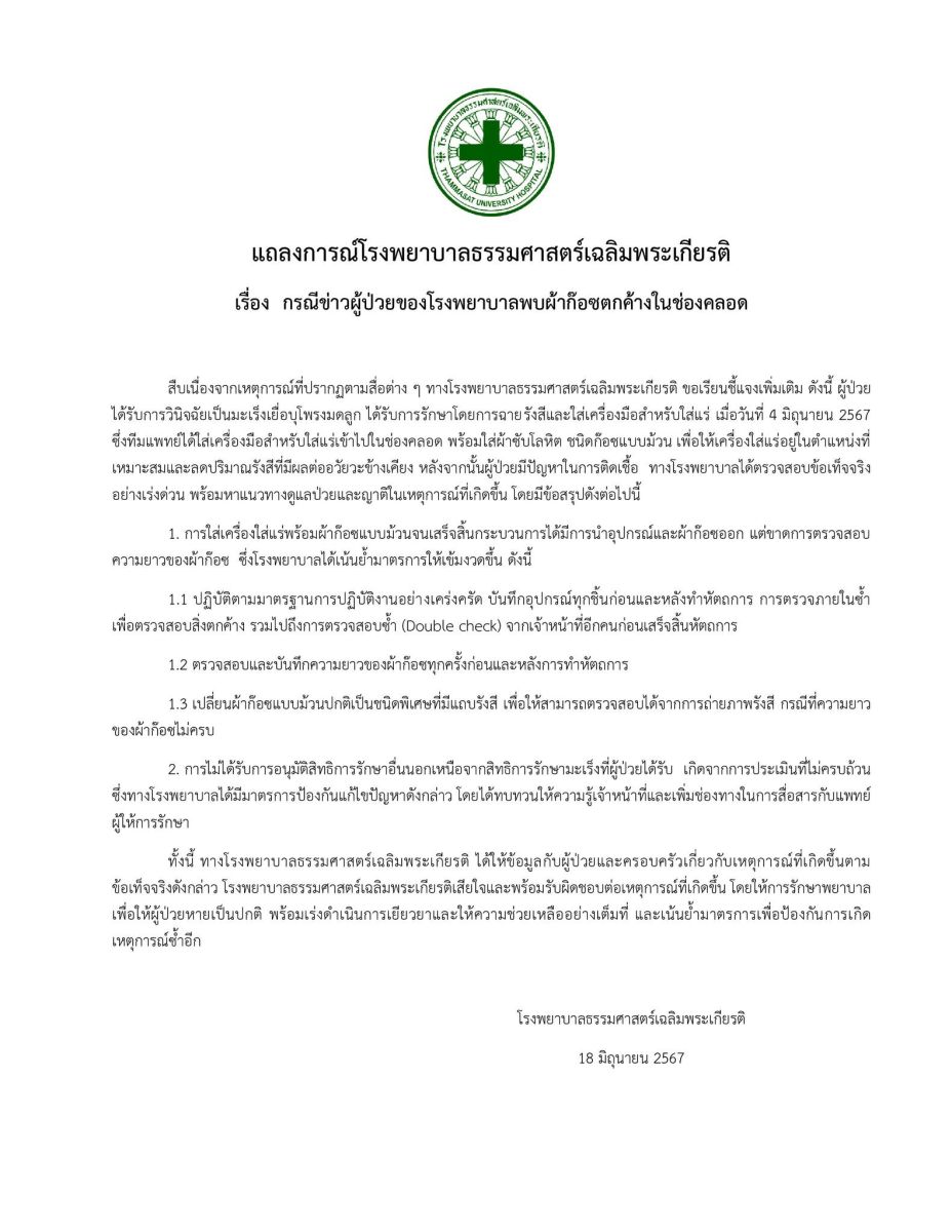 รพ.ธรรมศาสตร์เฉลิมพระเกียรติ แถลงปม ลืมผ้าก๊อซในช่องคลอดผู้ป่วย พร้อมรับผิดชอบต่อเหตุการณ์ที่เกิดขึ้น