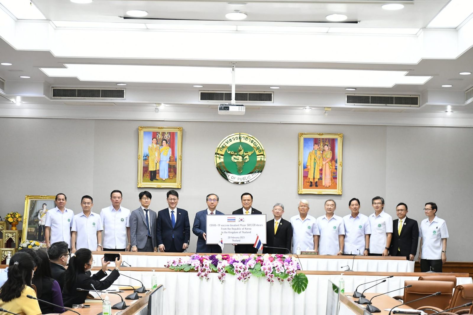วันนี้ (20 กุมภาพันธ์ 2566) ที่กระทรวงสาธารณสุข นายอนุทิน ชาญวีรกูล รองนายกรัฐมนตรีและรัฐมนตรีว่าการกระทรวงสาธารณสุข พร้อมด้วย นพ.โอภาส การย์กวินพงศ์ ปลัดกระทรวงสาธารณสุข นพ.ธเรศ กรัษนัยรวิวงค์ อธิบดีกรมควบคุมโรค และคณะผู้บริหารกระทรวงสาธารณสุข รับมอบวัคซีนโควิด 19 รุ่นใหม่ ไฟเซอร์ bivalent จำนวน 501,120 โดส จากรัฐบาลสาธารณรัฐเกาหลี โดยมี นาย มุน ซึงฮยอน (Moon Seoung-hyun) เอกอัครราชทูตสาธารณรัฐเกาหลี ประจำประเทศไทย นาย จอน โจยอง (Jeon Joyoung) อัครราชทูตสาธารณรัฐเกาหลี ประจำประเทศไทย และคณะ เป็นผู้แทนส่งมอบ