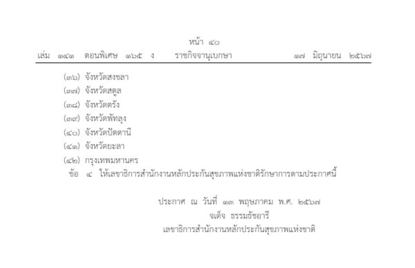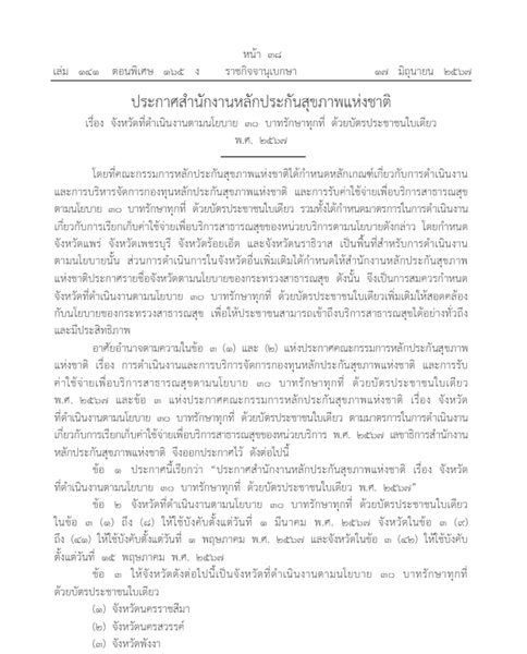 ราชกิจจานุเบกษา เผยแพร่ ประกาศ สำนักงานหลักประกันสุขภาพแห่งชาติ เรื่อง จังหวัดที่ดำเนินงานตามนโยบาย "30บาทรักษาทุกที่" ด้วย "บัตรประชาชน" ใบเดียว พ.ศ. 2567 ในพื้นที่ 42 จังหวัด โดยที่คณะกรรมการหลักประกันสุขภาพแห่งชาติไต้กำนตหลักเกณฑ์เกี่ยวกับการดำเนินงานและการบริหารจัดการกองทุนหลักประกันสุขภาพแห่งชาติ และการรับค่าใช้จ่ายเพื่อบริการสาธารณสุขตามนโยบาย "30บาทรักษาทุกที่" ด้วย บัตรประชาชน ใบเดียว รวมทั้งไต้กำหนดมาตรการในการดำเนินงานเกี่ยวกับการเรียกเก็บค่าใช้จ่ายเพื่อบริการสาธารณสุขของหน่วยบริการตามนโยบายดังกล่าว
