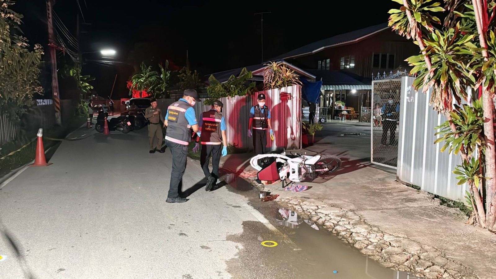 โดยที่เกิดเหตุ อยู่หน้าที่ทำการผู้ใหญ่บ้าน หมู่ 2 ตำบลบ้านหาด อำเภอบ้านลาด จังหวัดเพชรบุรี พบรถจักรยานยนต์ ฮอนด้า 125 สีขาว ทะเบียนป้ายแดง ล้มอยู่กลางถนน ใกล้กันพบขวดน้ำกระท่อมตกอยู่ 2 ขวด และพบปลอกกระสุนปืน ขนาด .11 ตกอยู่บนถนน 6 ปลอก ส่วนผู้ก่อเหตุคือ นายเฉลิมพล (สงวนนามสกุล) เป็นผู้ใหญ่บ้าน ยืนรอมอบตัวกับเจ้าหน้าที่ตำรวจ