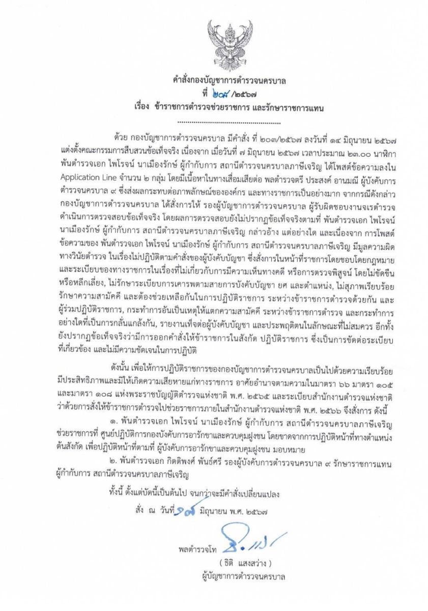 เอกสารระบุตอนหนึ่งว่า เนื่องจากเมื่อวันที่ 7 มิ.ย.2567 เวลาประมาณ 23.00 น. พ.ต.อ.ไพโรจน์ นาเมืองรักษ์ ผกก.สน.ภาษีเจริญ ได้โพสต์ข้อความลงในแอพพลิเคชั่นไลน์ จำนวน 2 กลุ่ม โดยมีเนื้อหาในทางเสื่อมเสียต่อ พล.ต.ต.ประสงค์ อานมณี ผบก.น.9 ซึ่งส่งผลกระทบต่อภาพลักษณ์ขององค์กร และทางราชการเป็นอย่างมาก จากกรณีดังกล่าว กองบัญชาการตำรวจนครบาลได้สั่งการให้ รองผู้บัญชาการตำรวจนครบาล ผู้รับผิดชอบงานจเรตำรวจ ดำเนินการตรวจสอบข้อเท็จจริง โดยผลการตรวจสอบยังไม่ปรากฏข้อเท็จจริงตามที่ พ.ต.อ.ไพโรจน์กล่าวอ้างแต่อย่างใด