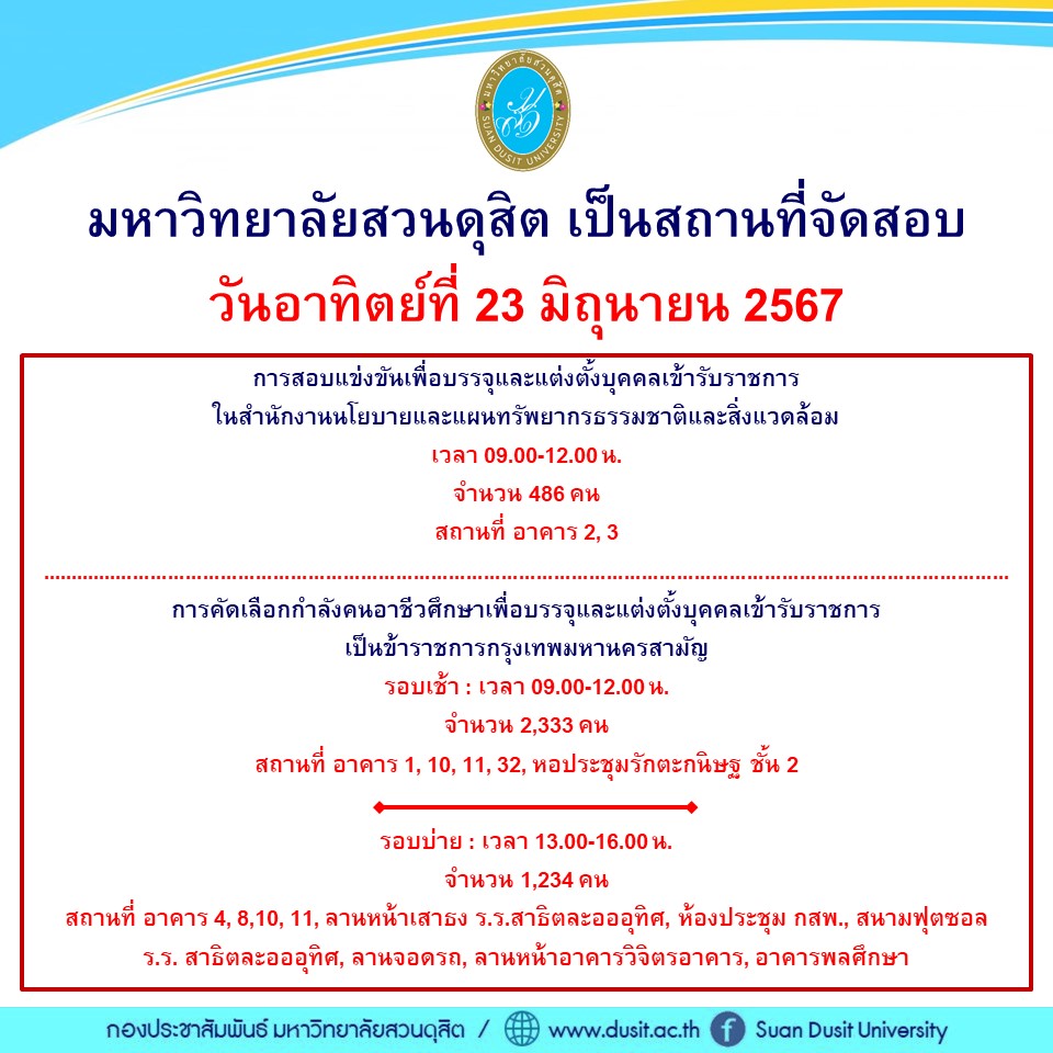 และวันอาทิตย์ที่ 23 มิถุนายน 2567 มหาวิทยาลัยสวนดุสิต เป็นสถานที่จัดสอบ การแข่งขันเพื่อบรรจุและแต่ตั้งบุคคลเข้ารับราชการ ในสำนักงานนโยบายและแผนทรัพยากรธรรมชาติและสิ่งแวดล้อม จำนวน 486 คน ตั้งแต่เวลา 09.00 -12.00 น.