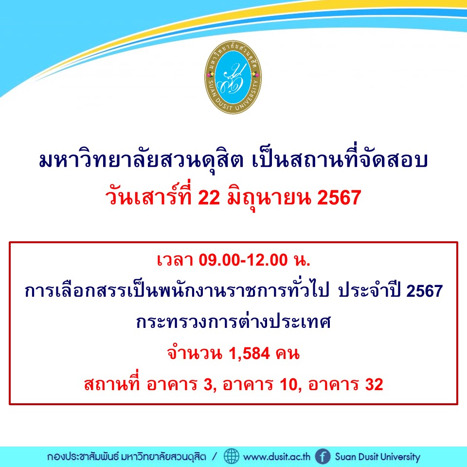 วันเสาร์ ที่ 22 มิถุนายน 2567 มหาวิทยาลัยสวนดุสิต เป็นสถานที่จัดสอบ การเลือกสรรเป็นพนักงานราชการทั่วไป ประจำปี 2567 กระทรวงการต่างประเทศ จำนวน 1,584 คน ตั้งแต่เวลา 09.00 -12.00 น.