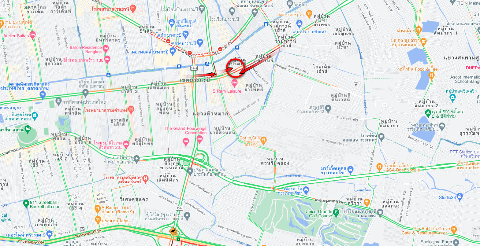 06.35 น. ถนนรามคำแหง บริเวณปากซอยรามคำแหง 103 เลยแยกลำสาลีเล็กน้อย มีท่อประปาแตก น้ำเริ่มไหลนองผิวการจราจร ทั้ง 2 ฝั่ง ส่งผลให้การจราจร ถนนรามคำแหง ขาเข้า ท้ายแถวสะสมปากซอยรามคำแหง 74 ขาออก ท้ายแถวสะสมแยกลำสาลี