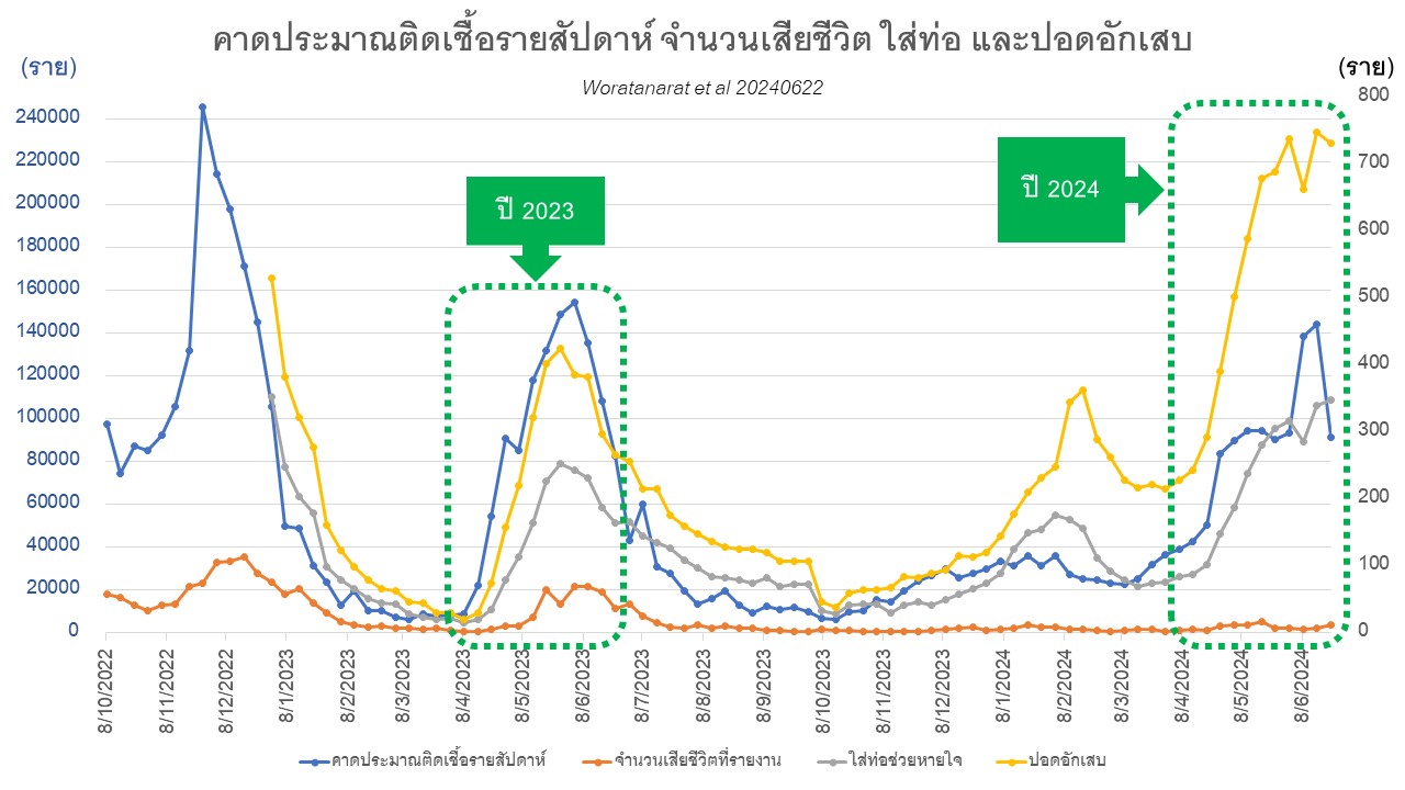 จำนวนผู้ป่วยรักษาตัวในโรงพยาบาล 1,823 ราย เสียชีวิต 12 ราย ปอดอักเสบ 732 ราย และใส่ท่อช่วยหายใจ 347 ราย ป่วยจนต้องนอน รพ.ลดลง 3ุ6.7% แต่ตายเพิ่มขึ้น 71% ปอดอักเสบลดลง 2.1% และใส่ท่อเพิ่มอีก 2.4% หากเทียบเวลานี้ของปีนี้กับปีที่แล้ว ผู้ป่วยนอนรักษาตัวในรพ.เยอะกว่าปีก่อน 10.3% ส่วนปอดอักเสบ มากกว่าปีก่อนถึง 2.7 เท่า และใส่ท่อช่วยหายใจมากกว่าปีก่อน 2.1 เท่า จำนวนผู้ป่วยใส่ท่อช่วยหายใจ ถือว่าสูงสุดในรอบ 1 ปีครึ่ง นับตั้งแต่ปลายธันวาคม 2022 เป็นต้นมา คาดประมาณจำนวนคนติดเชื้อใหม่ต่อวันอย่างน้อย 13,022-18,086 ราย ความรู้เกี่ยวกับธรรมชาติของการระบาดดูจะใช้ได้ดีในการประเมินสถานการณ์ ดังที่ได้เคยบอกไว้ก่อนหน้านี้ว่าระลอกนี้จะพีคในช่วงสองสัปดาห์แรกของมิถุนายน ไทยเราพีคระลอก JN.1 ไปเมื่อ 15 มิถุนายนที่ผ่านมา