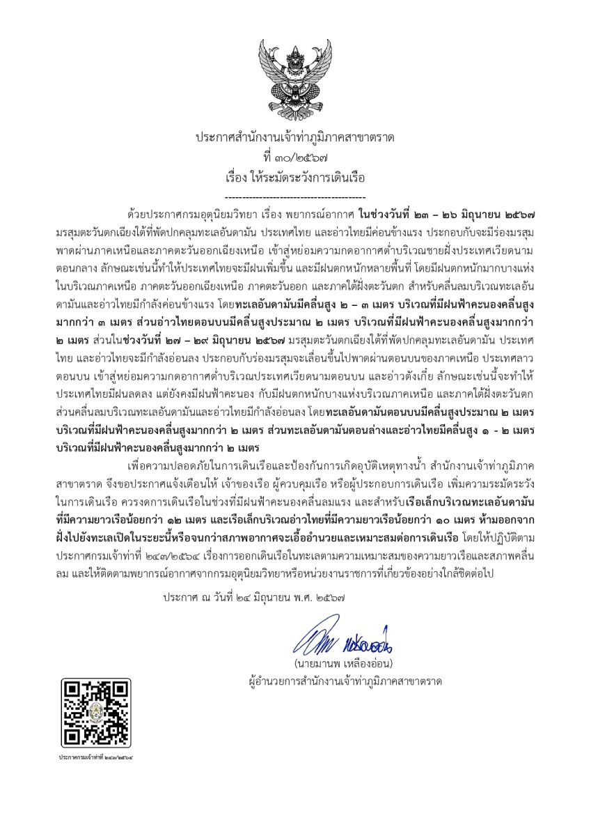 สำนักงานเจ้าท่าภูมิภาคสาขาตราด ออกประกาศเตือน เรือเล็กบริเวณอ่าวไทยที่มีความยาวเรือน้อยกว่า 10 เมตร ห้ามออกจากฝั่งไปยังทะเลเปิดในระยะนี้