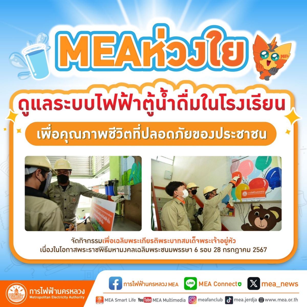 MEA หรือการไฟฟ้านครหลวง มีความห่วงใยประชาชนใช้ตู้น้ำดื่มได้อย่างปลอดภัย จัดกิจกรรมตรวจสอบระบบไฟฟ้าตู้น้ำดื่ม เพื่อความปลอดภัยให้กับสถานศึกษาในสังกัดสำนักงานคณะกรรมการการศึกษาขั้นพื้นฐาน (สพฐ.) จำนวน 275 โรงเรียน ในโครงการ กฟน. รวมใจภักดิ์ ทำความดีเพื่อในหลวง เฉลิมพระเกียรติพระบาทสมเด็จพระเจ้าอยู่หัว เนื่องในโอกาสมหามงคลเฉลิมพระชนมพรรษา 6 รอบ 28 กรกฏาคม 2567 พร้อมสร้างประโยชน์ต่อสังคมและใส่ใจต่อสิ่งแวดล้อมควบคู่กับความห่วงใยคุณภาพชีวิตของประชาชน