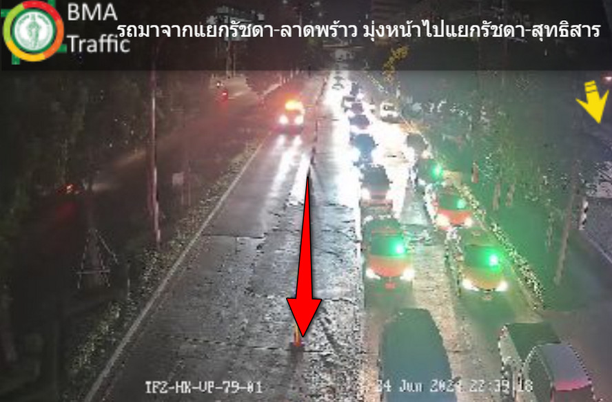 เวลา 22.40 น. วันที่ 24 มิถุนายน 2567 มีเจ้าหน้าที่กำลังทำงาน ปิดการจราจร ภายในอุโมงค์ลอดแยกรัชดาภิเษก - สุทธิสาร เบี่ยงการจราจรใช้พื้นราบ ผ่านแยกได้ตามสัญญาณไฟจราจร มีท้ายแถวสะสมช่วงก่อนถึงปากทางลงอุโมงค์ฯ