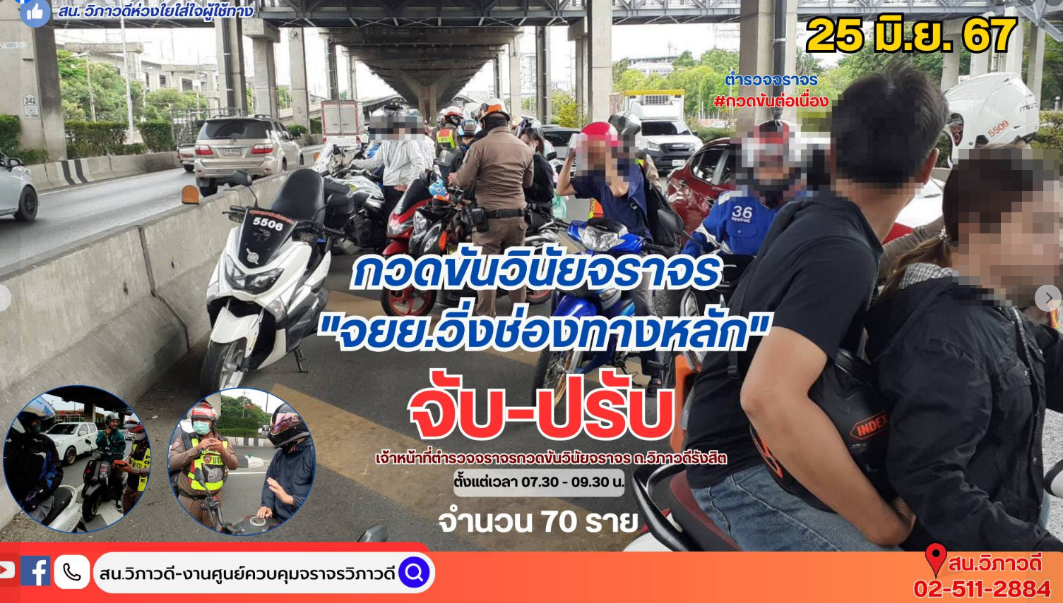 25 มิ.ย. 2567 เวลา 07.30 - 09.00 น. เจ้าหน้าที่ตำรวจจราจรงานศูนย์ควบคุมจราจรวิภาวดีรังสิต ปฎิบัติหน้าที่กวดขันวินัยการจราจร จยย.วิ่งช่องทางหลัก ในเขตพื้นที่ถนนวิภาวดีรังสิต ขาเข้า ช่วงเวลาเร่งด่วนเช้า จำนวนกว่า 70 ราย และจะดำเนินการกวดขันต่อเนื่องสำหรับผู้ที่ฝ่าฝืนต่อไป