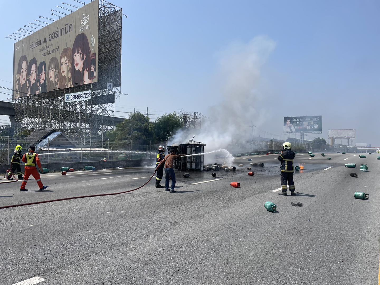 สถานที่เกิดเหตุ บริเวณทางหลวงพิเศษหมายเลข 7 (กิโลเมตรที่ 6) แขวงประเวศ เขตประเวศ กรุงเทพมหานคร ฝั่งขาเข้ามุ่งหน้ากรุงเทพฯ ตรวจสอบที่เกิดเหตุเป็นเพลิงไหม้รถบรรทุกขนาดกลาง บรรทุกถังแก๊สบรรจุขนาด 15 กิโลกรัม ชนิดหกล้อ รถใช้เชื้อเพลิงชนิดน้ำมันดีเซล เพลิงลุกไหม้เสียหายหมดทั้งคัน รถดับเพลิงใช้น้ำทำการดับเพลิงสงบ และระบายแก๊สเป็นที่เรียบร้อย ข้อสันนิษฐานเบื้องต้นสาเหตุเพลิงไหม้เกิดจากอุบัติเหตุรถพลิกคว่ำ ทำให้ถังแก๊สรั่วไหล เกิดการจุดติด และลุกลามตัวรถบรรทุก ที่เกิดเหตุมีผู้ได้รับบาดเจ็บ 1 ราย เพศชาย โดนไฟคลอกตามร่างกาย อาสาสมัครนำส่งโรงพยาบาลสิรินธรเป็นที่เรียบร้อย พื้นที่รับผิดชอบของสถานีดับเพลิงและกู้ภัยประเวศ