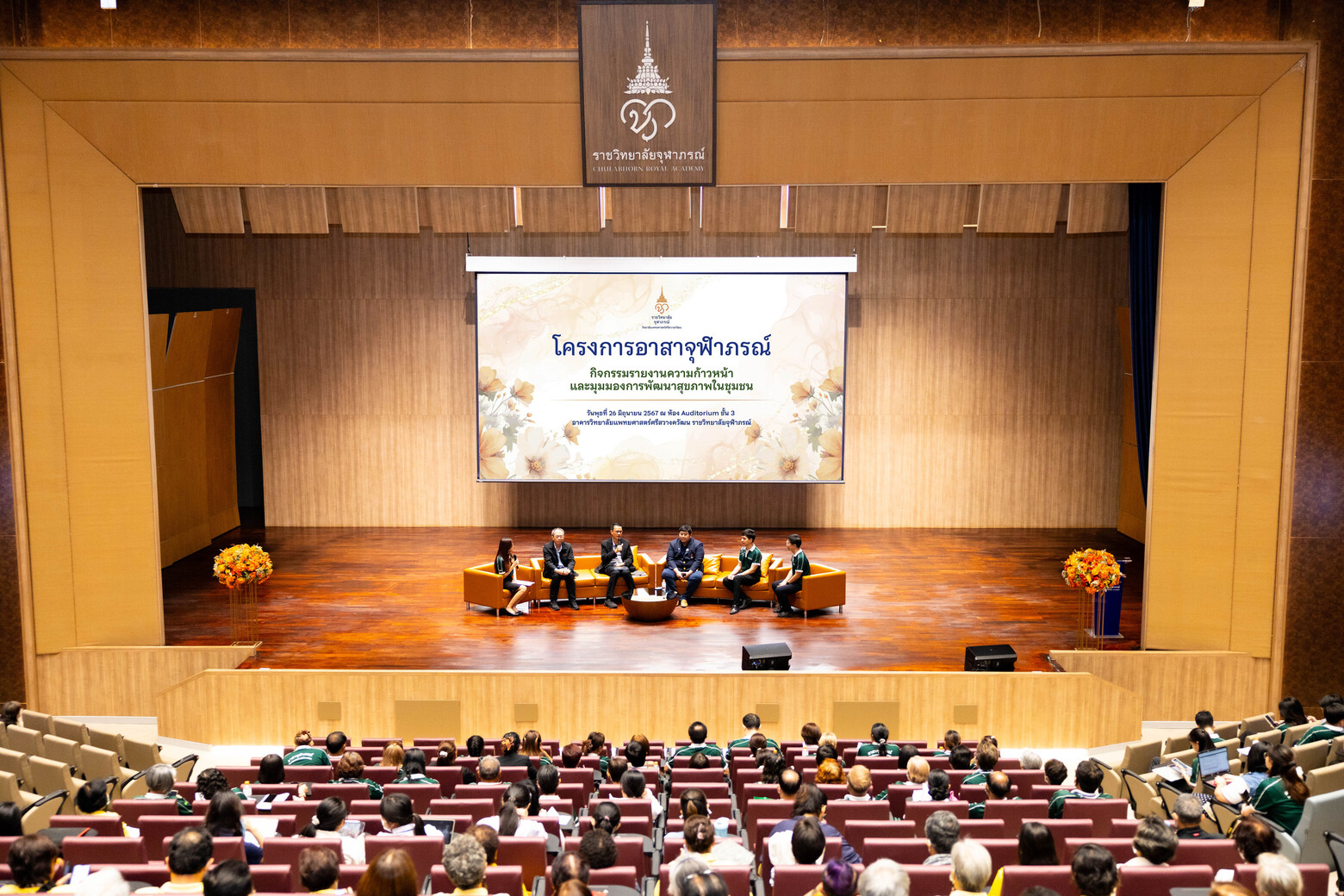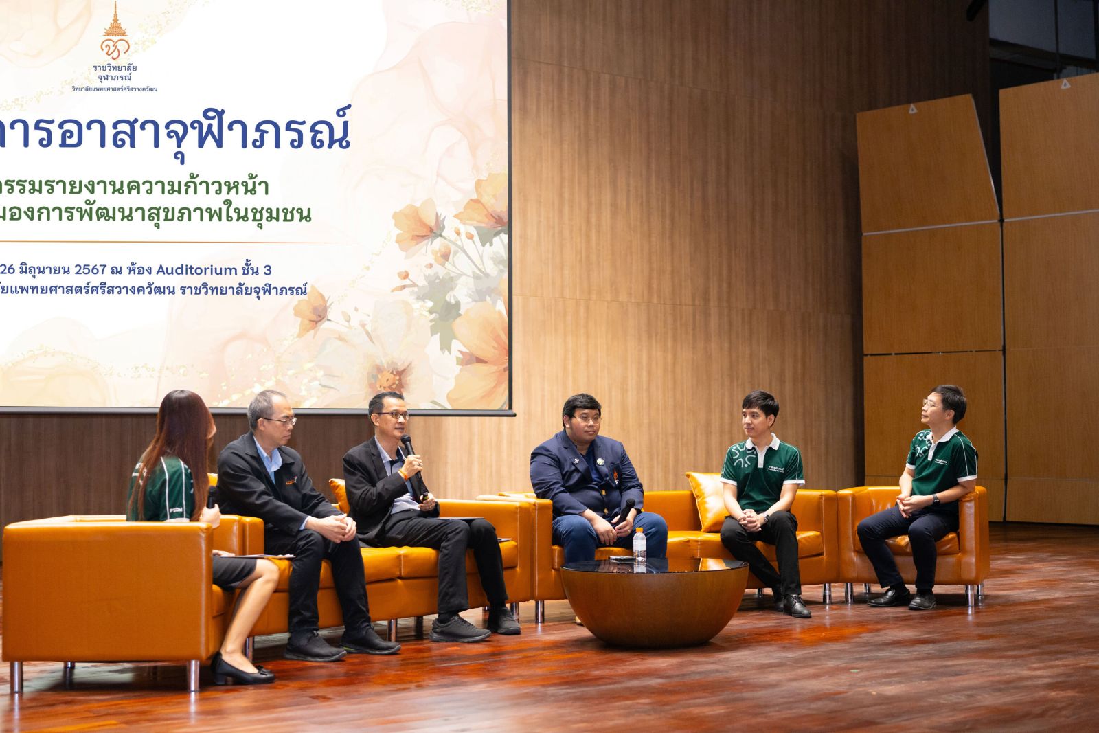 ในงานมีการเสวนา “เมืองสุขภาพดีสร้างได้” โดย นายแพทย์กมล พรมลังกา ผู้อำนวยการโรงพยาบาลบ้านหลวง จ.น่าน ตัวแทนอาสาจุฬาภรณ์ชุมชนเมืองและชุมชนชนบท และตัวแทนนักศึกษาวิทยาลัยแพทยศาสตร์ศรีสวางควัฒน และการเสวนา “แนวทางการบูรณาการสหสาขาเพื่อพัฒนาชุมชนต้นแบบอาสาจุฬาภรณ์” โดย ดร.สีใส ยี่สุนแสง รองผู้อำนวยการกองระบาดวิทยา กรมควบคุมโรค นายดุสิต ศรีโคตร ผู้อำนวยการฝ่ายสนับสนุนการจัดหลักประกันสุขภาพ สำนักงานประกันสุขภาพแห่งชาติ หรือ สปสช. ผู้ช่วยศาสตราจารย์ นายแพทย์วิสุทธิ์ ล้ำเลิศธน อาจารย์ ดร.ทศพร เฟื่องรอด ผู้ช่วยศาสตราจารย์ ดร.วิริยะ มหิกุล อาจารย์ประจำวิทยาลัยแพทยศาสตร์ศรีสวางควัฒน ดำเนินรายการโดย ผู้ช่วยศาสตราจารย์ ดร.ลอองดาว ทองนาค และ ผู้ช่วยศาสตราจารย์ ดร.กมลวรรณ แช่มช้อย