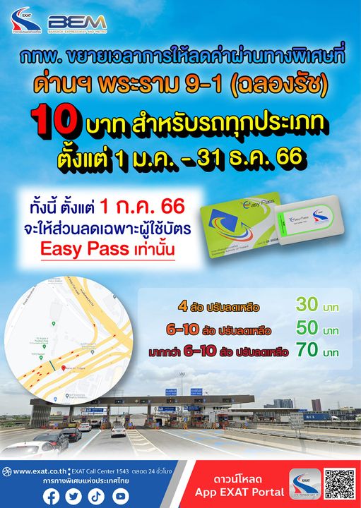 กทพ. ขยายเวลาการให้ลดค่าผ่านทางพิเศษที่ด่านฯ พระราม 9-1 (ฉลองรัช) 10 บาท สำหรับรถทุกประเภท ตั้งแต่ 1 มกราคม – 31 ธันวาคม 2566 ทั้งนี้ ตั้งแต่ 1 กรกฎาคม 2566 จะให้ส่วนลดเฉพาะผู้ใช้บัตร Easy Pass เท่านั้น