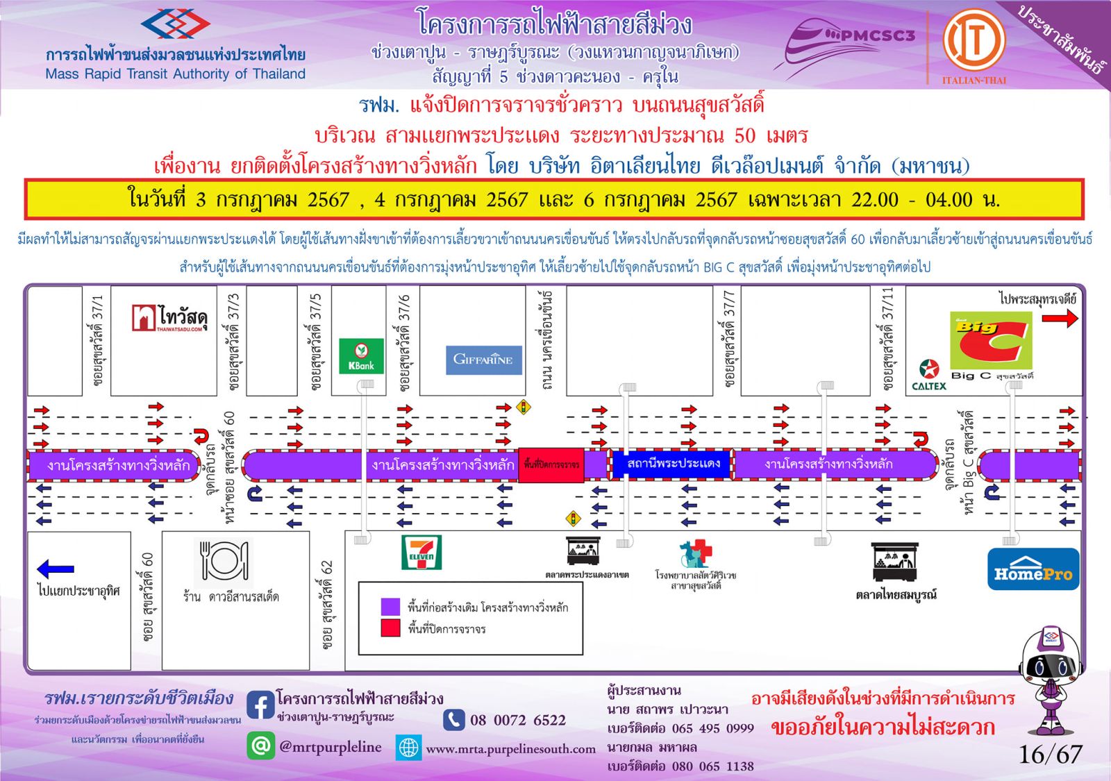 การรถไฟฟ้าขนส่งมวลชนแห่งประเทศไทย (รฟม.) แจ้งว่า บริษัท อิตาเลียนไทย ดีเวล๊อปเมนต์ จำกัด (มหาชน) ผู้รับจ้างงานก่อสร้างทางวิ่งและสถานียกระดับ อาคารจอดรถไฟฟ้าและอาคารจอดแล้วจร โครงการรถไฟฟ้าสายสีม่วง ช่วงเตาปูน – ราษฎร์บูรณะ (วงแหวนกาญจนาภิเษก) สัญญาที่ 5 ช่วงดาวคะนอง – ครุใน มีความจำเป็นต้องปิดการจราจรชั่วคราว บนถนนสุขสวัสดิ์ บริเวณสามแยกพระประแดง ระยะทางประมาณ 50 เมตร เพื่องานยกติดตั้งโครงสร้างทางวิ่งหลัก ในวันที่ 3 , 4 และ 6 กรกฎาคม 2567 เฉพาะเวลา 22.00 – 04.00 น. มีผลให้ไม่สามารถสัญจรผ่านแยกพระประแดงในช่วงเวลาดังกล่าวได้ โดยผู้ใช้เส้นทางฝั่งขาเข้าที่ต้องการเลี้ยวขวาเข้าถนนนครเขื่อนขันธ์ ให้ตรงไปกลับรถที่จุดกลับรถหน้าซอยสุขสวัสดิ์ 60 เพื่อกลับมาเลี้ยวซ้ายเข้าสู่ถนนนครเขื่อนขันธ์ สำหรับผู้ใช้เส้นทางจากถนนนครเขื่อนขันธ์ที่ต้องการมุ่งหน้าประชาอุทิศ ให้เลี้ยวซ้ายไปใช้จุดกลับรถหน้า BIG C สุขสวัสดิ์ เพื่อมุ่งหน้าประชาอุทิศต่อไป