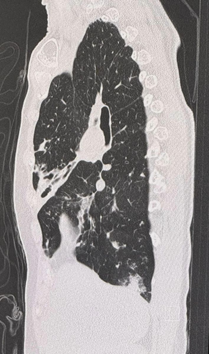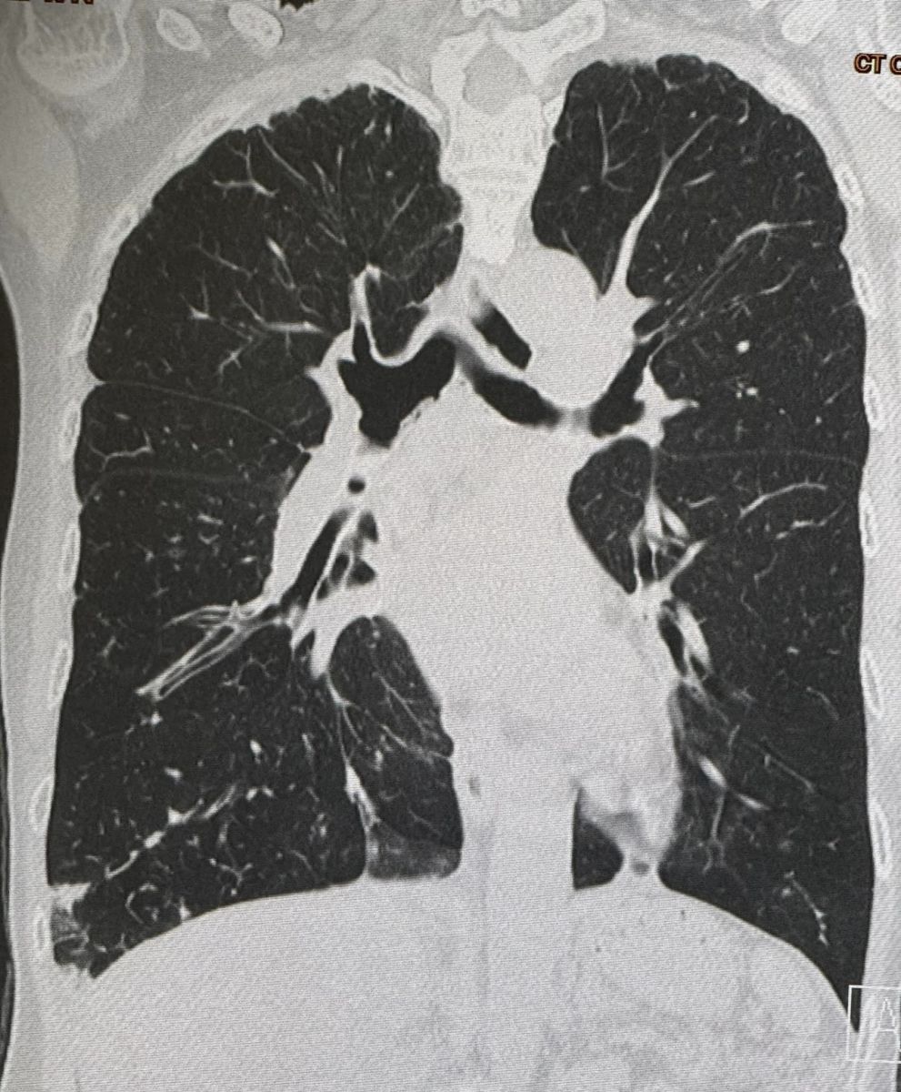 จากการตรวจร่างกาย ฟังปอดมีเสียงผิดปกติทั้ง 2 ข้าง เอกซเรย์ปอดผิดปกติเข้าได้กับหลอดลมโป่งพองทั้ง 2 ข้าง (ดูรูป) ทำคอมพิวเตอร์ปอดเห็นหลอดลมโป่งพองในปอดทั้ง 2 ข้าง (ดูรูป) ส่งเสมหะย้อมเชื้อหาวัณโรค AFB smear ให้ผลบวก วินิจฉัย: โรคหลอดลมโป่งพอง สงสัยติดเชื้อวัณโรค หรือวัณโรคเทียม จึงให้ยา INH,rifampicin,ethambutol รักษาวัณโรค ร่วมกับ azithromycin รักษาวัณโรคเทียม 2 สัปดาห์ หลังกินยาดีขึ้น หยุดไอ ไม่มีเสมหะ ผลเพาะเชื้อขึ้นเชื้อวัณโรคเทียม 3 ชนิด คือ M.fortuitum, M. intracellulare และ M. gordonae เมื่อทราบผลเพาะเชื้อได้หยุดยาทุกชนิดก่อน ขอเก็บเสมหะอีกครั้งแต่เก็บไม่ได้ เพราะไม่มีเสมหะ แนะนำให้หยุดการเทปุ๋ยรอบต้นไม้ในสวน