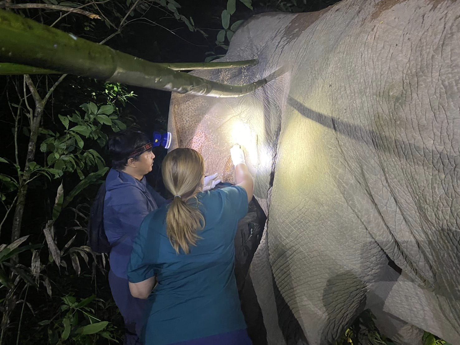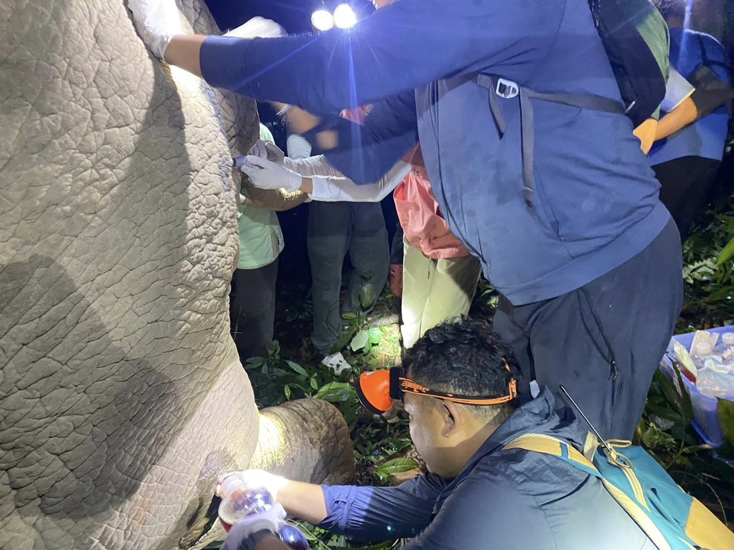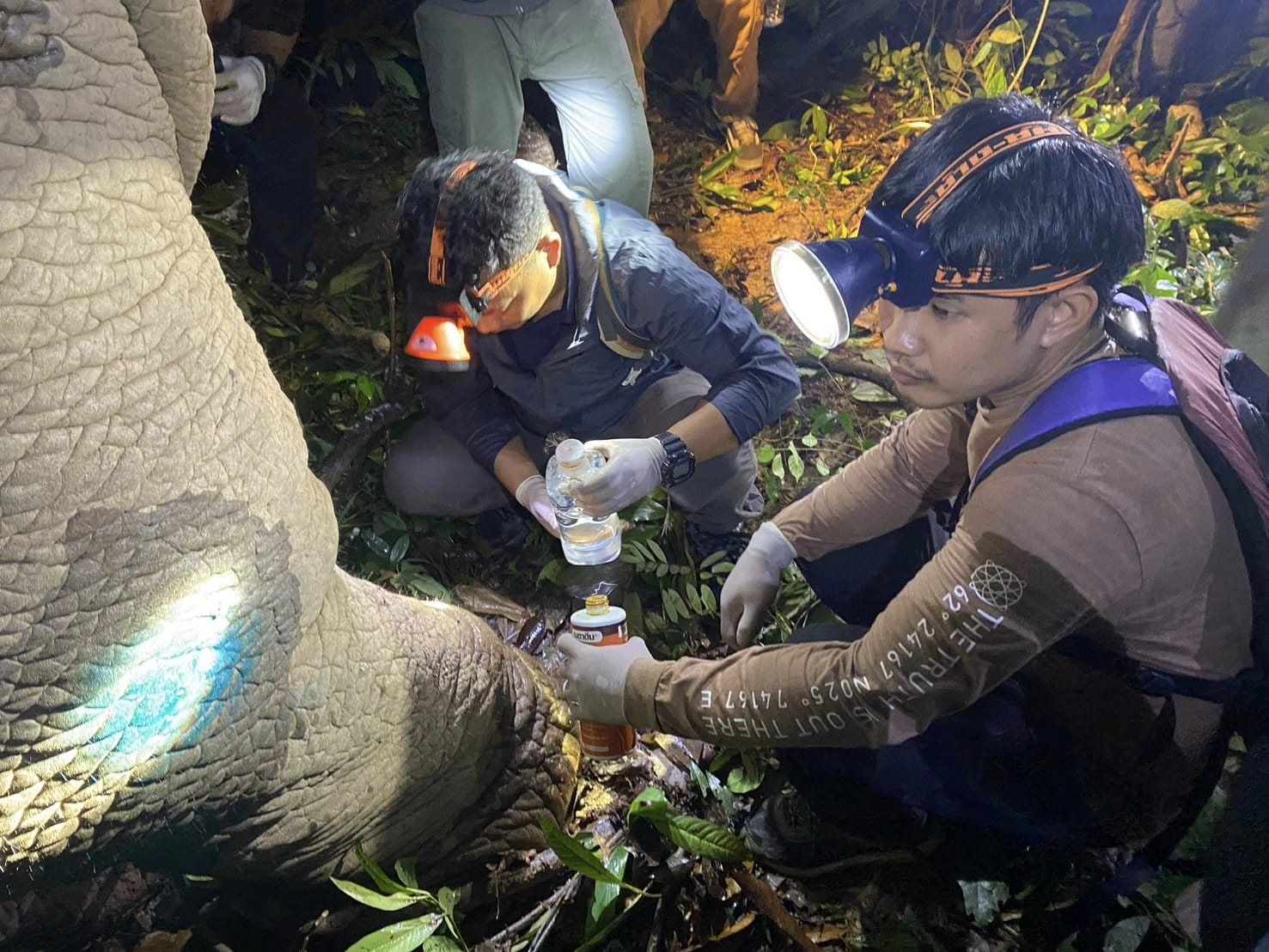 นางสาวมัชฌมณ แก้วพฤหัสชัย นายสัตวแพทย์ชำนาญการ หัวหน้าศูนย์ช่วยเหลือสัตว์ป่าที่ 2 (กระบกคู่) นางสาวกิตติยาภรณ์ เอี่ยมสะอาด นายสัตวแพทย์ชำนาญการ กลุ่มงานจัดการสุขภาพสัตว์ป่า สำนักอนุรักษ์สัตว์ป่า และเจ้าหน้าที่ได้ทำการวางยาซึมเพื่อเข้ารักษา ขาหลังซ้ายซึ่งมีรูแผลข้างๆ หัวเข่า กว้างประมาณ 1 นิ้ว ลึกประมาณ 2 เซนติเมตร มีหนอง และพบยังว่ามีแผลบริเวณหลังด้านซ้าย ลักษณะแผลเป็นรอยนูนขึ้นมา ส่วนฝ่าเท้าขาหลังซ้ายไม่มีแผล ไม่มีสิ่งแปลกปลอม