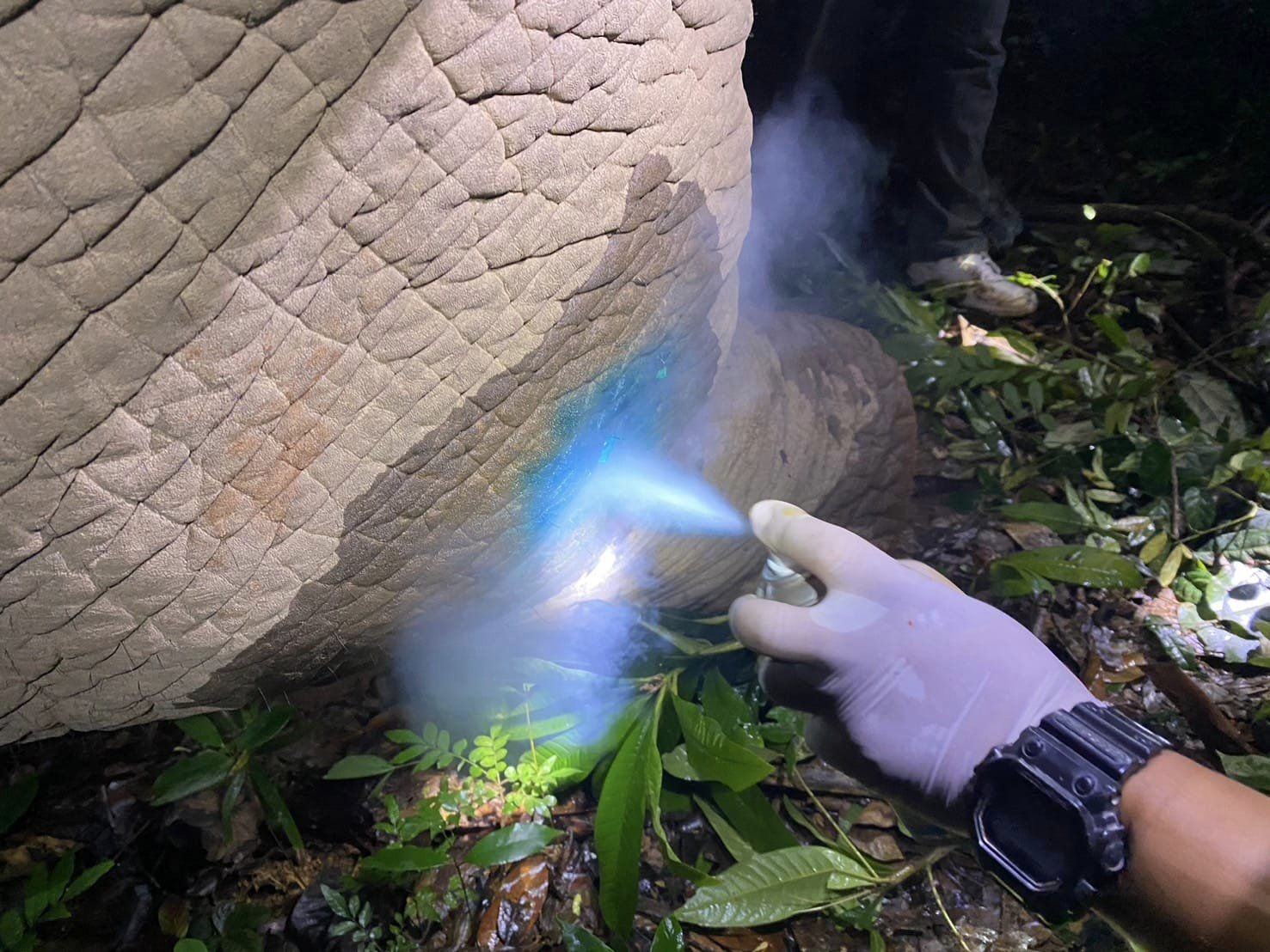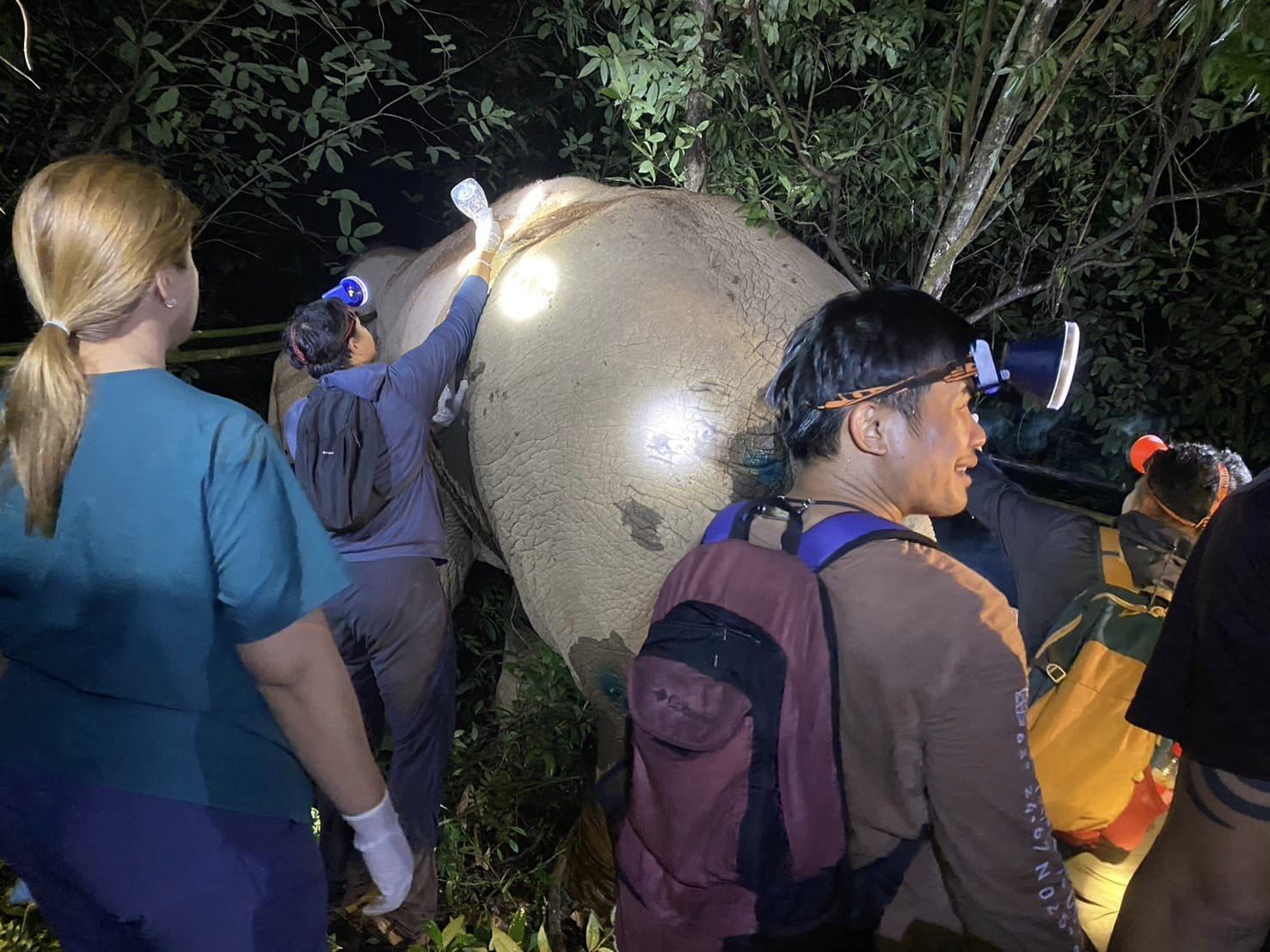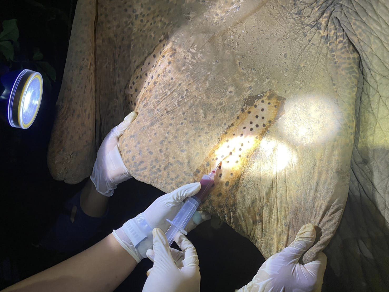 นางสาวมัชฌมณ แก้วพฤหัสชัย นายสัตวแพทย์ชำนาญการ หัวหน้าศูนย์ช่วยเหลือสัตว์ป่าที่ 2 (กระบกคู่) นางสาวกิตติยาภรณ์ เอี่ยมสะอาด นายสัตวแพทย์ชำนาญการ กลุ่มงานจัดการสุขภาพสัตว์ป่า สำนักอนุรักษ์สัตว์ป่า และเจ้าหน้าที่ได้ทำการวางยาซึมเพื่อเข้ารักษา ขาหลังซ้ายซึ่งมีรูแผลข้างๆ หัวเข่า กว้างประมาณ 1 นิ้ว ลึกประมาณ 2 เซนติเมตร มีหนอง และพบยังว่ามีแผลบริเวณหลังด้านซ้าย ลักษณะแผลเป็นรอยนูนขึ้นมา ส่วนฝ่าเท้าขาหลังซ้ายไม่มีแผล ไม่มีสิ่งแปลกปลอม