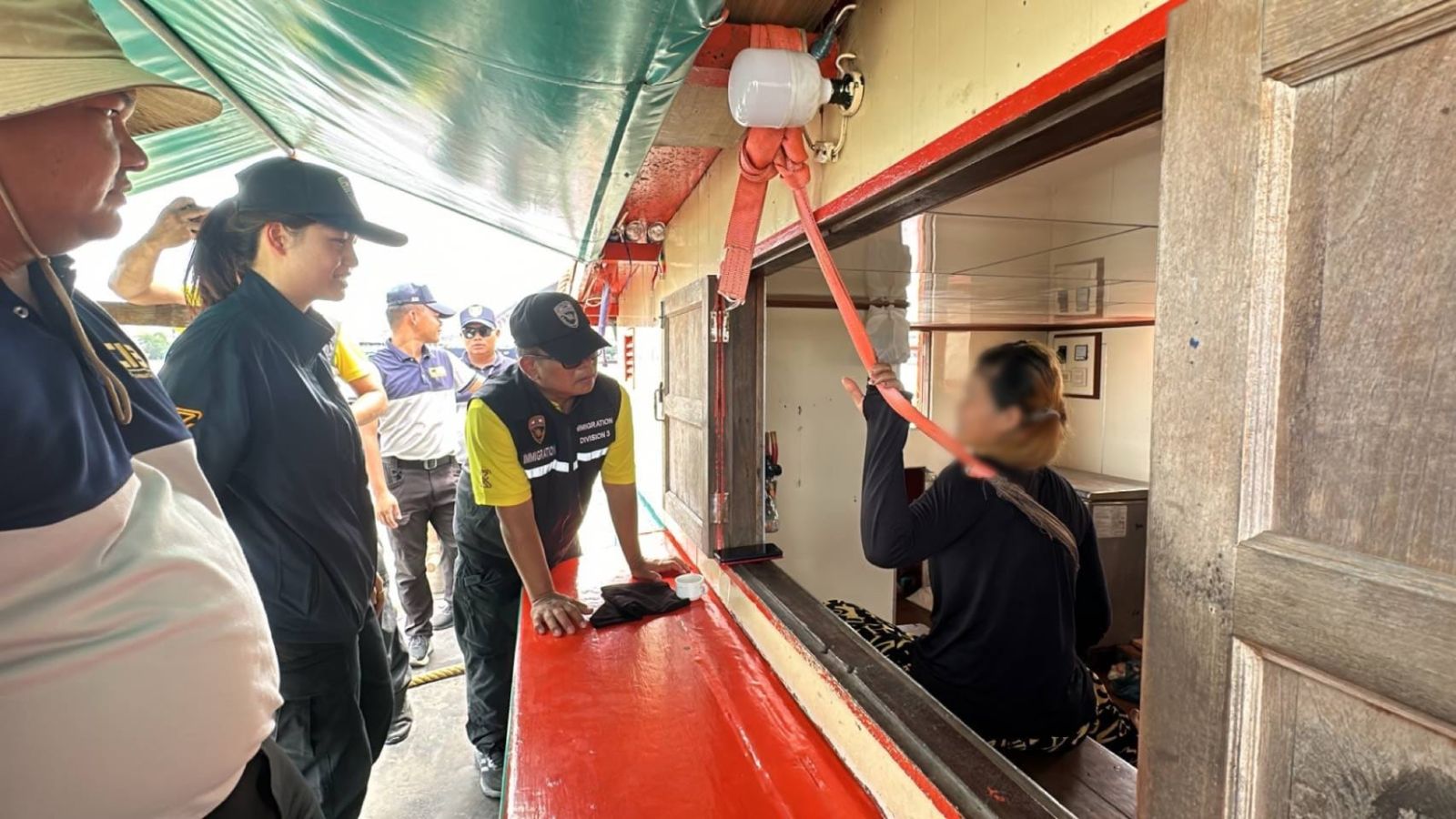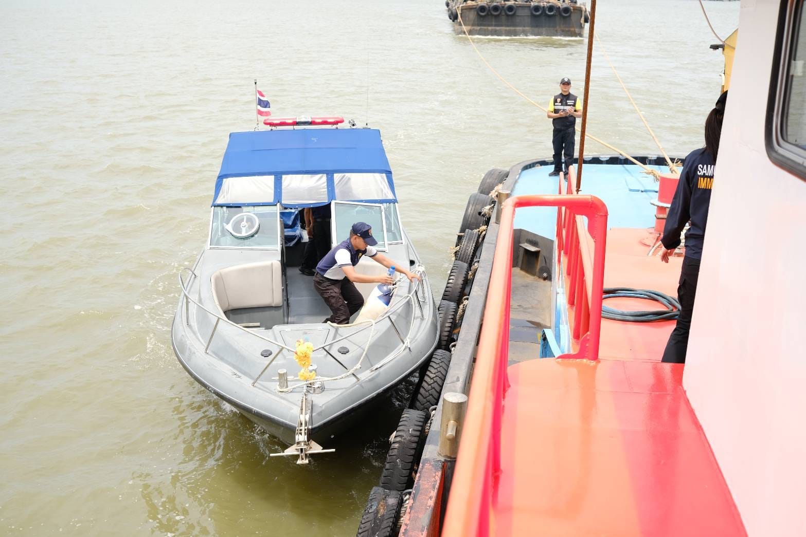 จากนั้น เจ้าหน้าที่ตำรวจชุดจับกุมจึงได้นำเรือตรวจการณ์ รน.58 ออกตรวจอย่างต่อเนื่อง โดยพบเรือลำเลียงอีกลำกำลังจอดอยู่ในแม่น้ำเจ้าพระยาบริเวณหลักจอดเรือกลางน้ำ ตำบลบางหัวเสือ อำเภอพระประแดง จังหวัดสมุทรปราการ เจ้าหน้าที่จึงแสดงตัวเป็นเจ้าพนักงานและขอขึ้นตรวจสอบเรือ จากการตรวจสอบพบบุคคลต่างด้าวจำนวน 4 นาย ทำหน้าที่ผู้ควบคุมเรือ และผู้ช่วยผู้ควบคุมเรือ ซึ่งทั้ง 4 รายไม่มีเอกสารทางราชการใด ๆ ให้เจ้าหน้าที่ตรวจสอบ