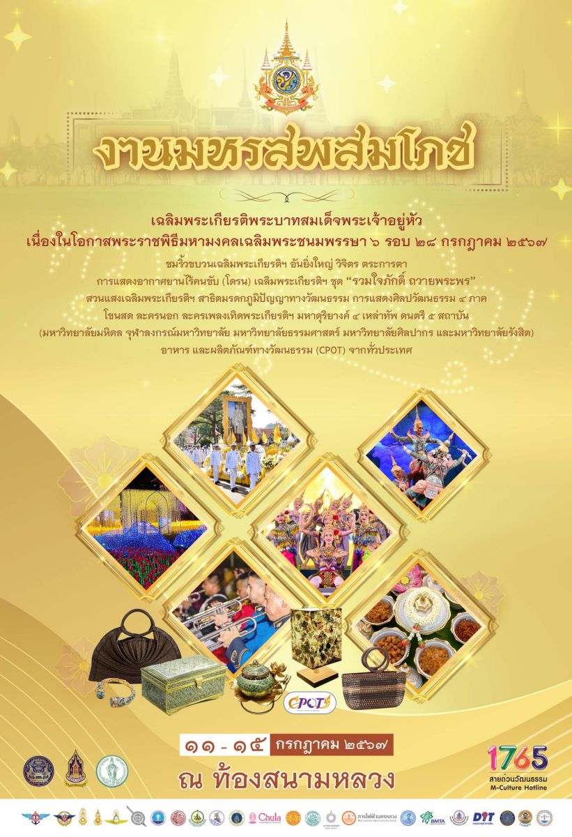 รัฐบาล โดยกระทรวงวัฒนธรรม ขอเชิญประชาชนร่วมงานมหรสพสมโภชเฉลิมพระเกียรติพระบาทสมเด็จพระเจ้าอยู่หัว เนื่องในโอกาสพระราชพิธีมหามงคลเฉลิมพระชนมพรรษา 6 รอบ 28 กรกฎาคม 2567 ชมริ้วขบวนทางวัฒนธรรมวิจิตรตระการตา นิทรรศการสวนแสง การแสดงโดรนเฉลิมพระเกียรติฯ การแสดงโขน มหาดุริยางค์ 4 เหล่าทัพ ดนตรี 5 สถาบัน การสาธิตมรดกภูมิปัญญา ตลาดวัฒนธรรม และพบกับศิลปินดารารับเชิญมากมาย