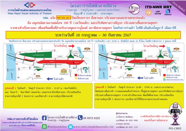 การรถไฟฟ้าขนส่งมวลชนแห่งประเทศไทย (รฟม.) แจ้งว่า กิจการร่วมค้า ไอทีดี-เอ็นดับเบิ้ลยูอาร์ เอ็มอาร์ที ผู้รับจ้างงานออกแบบและก่อสร้างอุโมงค์ทางวิ่งและสถานีใต้ดิน โครงการรถไฟฟ้าสายสีม่วง ช่วงเตาปูน - ราษฎร์บูรณะ (วงแหวนกาญจนาภิเษก) สัญญาที่ 3 ช่วงผ่านฟ้า - สะพานพุทธ มีความจำเป็นต้องขยายเวลาปิดเบี่ยงจราจร ฝั่งขาออก บริเวณทางลงสะพานพระปกเกล้า ถึง อนุสรณ์สถานงานสมโภช 100 ปี (วงเวียนเล็ก) และปรับทิศทางการสัญจร บริเวณทางขึ้นสะพานพุทธฯ จากขาเข้าเป็นขาออก เพื่อเตรียมพื้นที่สำหรับงานขุดเจาะอุโมงค์ สถานีสะพานพุทธฯ ระหว่างวันที่ 10 กรกฎาคม – 30 กันยายน 2567 โดยมีการจัดการจราจร 2 รูปแบบ ดังนี้