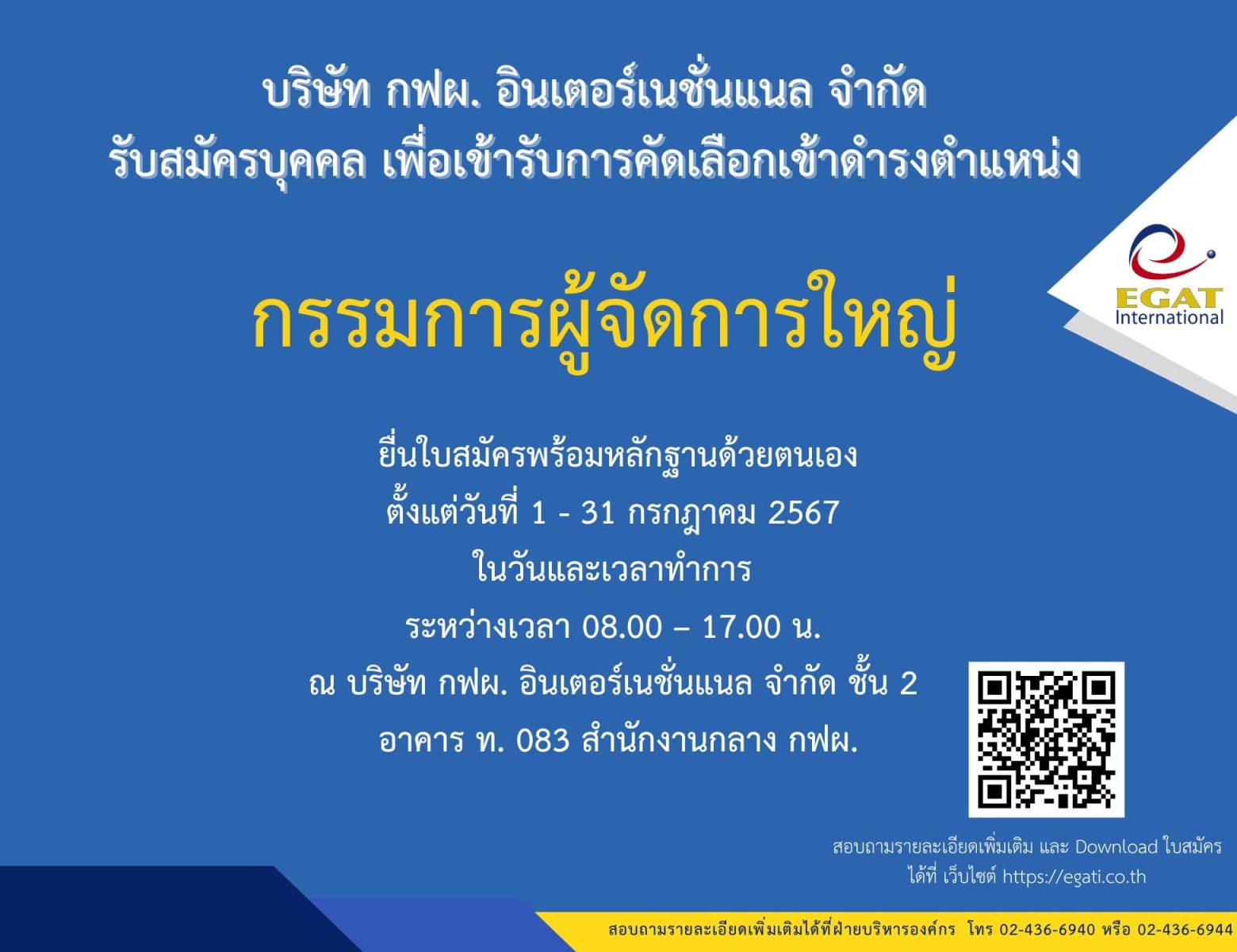 1. ตำแหน่งกรรมการผู้จัดการใหญ่ กำหนดยื่นใบสมัครระหว่างวันที่ 1 - 31 กรกฎาคม 2567 สามารถดูรายละเอียดเพิ่มเติม พร้อมทั้งดาวน์โหลดใบสมัครที่เว็บไซต์ https://egati.co.th/th/7082/
