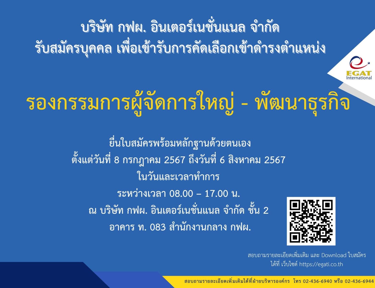 2. ตำแหน่งรองกรรมการผู้จัดการใหญ่ – พัฒนาธุรกิจ กำหนดยื่นใบสมัครระหว่างวันที่ 8 กรกฎาคม - 6 สิงหาคม 2567 สามารถดูรายละเอียดเพิ่มเติม พร้อมทั้งดาวน์โหลดใบสมัครที่เว็บไซต์ https://egati.co.th/th/7113/