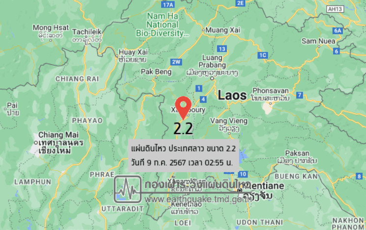 เวลา 02.55 น. วันที่ 9 กรกฎาคม 2567 กองเฝ้าระวังแผ่นดินไหว กรมอุตุนิยมวิทยา แจ้งเหตุแผ่นดินไหว ขนาด 2.2 ความลึก 1 กม. ภายในพื้นที่ของประเทศลาว (19.17°N,101.62°E) ศูนย์กลางห่างออกไปทางทิศตะวันออกเฉียงใต้ของ บ้านน้ำช้าง ต.ขุนน่าน อ.เฉลิมพระเกียรติ จ.น่าน ประมาณ 60 กม. ขณะนี้ยังไม่มีรายงานผลกระทบต่อประเทศไทย