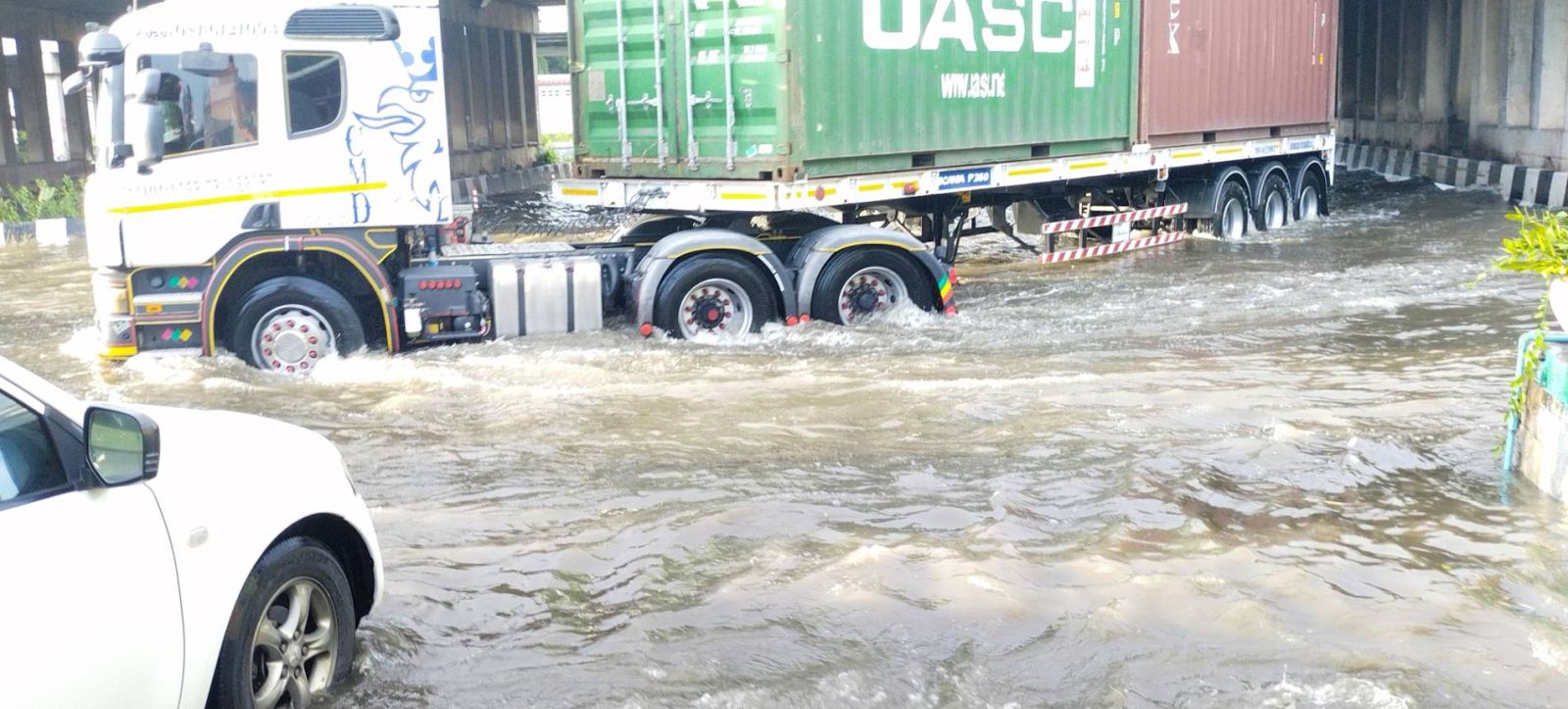 07.06 น. ถนนพระราม 2 ขาออก บริเวณจุดกลับรถหน้าโรงเรียนสารสาสน์วิเทศสมุทรสาคร เช้านี้ น้ำทะเลหนุนสูงมาก รถเล็กไม่สามารถผ่านทางได้ การจราจรติดขัดมาก