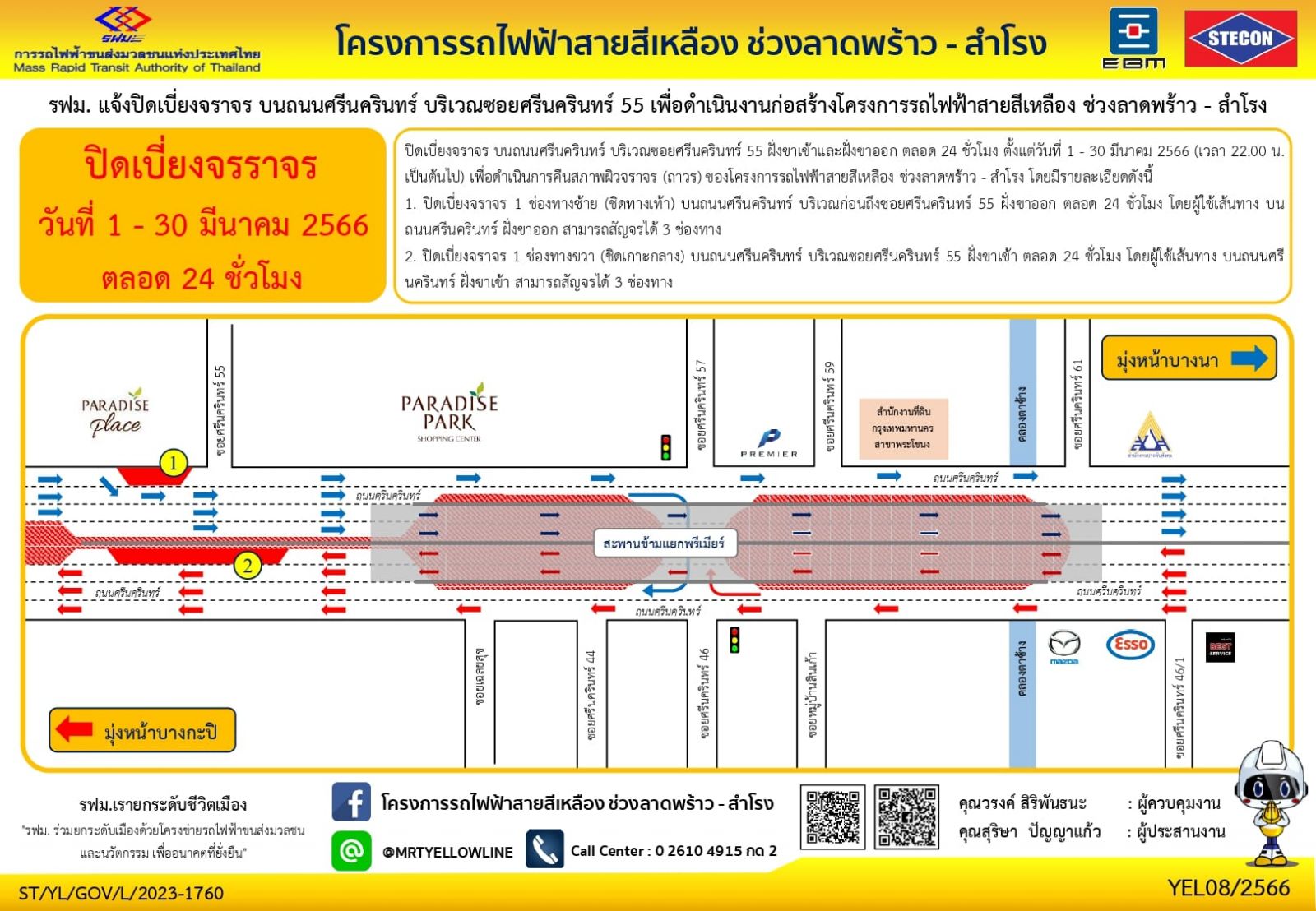การรถไฟฟ้าขนส่งมวลชนแห่งประเทศไทย (รฟม.) แจ้งว่า บริษัท ซิโน-ไทย เอ็นจีเนียริ่ง แอนด์ คอนสตรัคชั่น จำกัด (มหาชน) ผู้รับจ้างก่อสร้างงานโยธา โครงการรถไฟฟ้าสายสีเหลือง ช่วงลาดพร้าว - สำโรง มีความจำเป็นต้องปิดเบี่ยงจราจร บนถนนศรีนครินทร์ บริเวณซอยศรีนครินทร์ 55 ฝั่งขาเข้าและฝั่งขาออก ตลอด 24 ชั่วโมง ตั้งแต่วันที่ 1 - 30 มีนาคม 2566 (เวลา 22.00 น. เป็นต้นไป) เพื่อดำเนินการคืนสภาพผิวจราจร (ถาวร) ของโครงการรถไฟฟ้าสายสีเหลืองฯ โดยมีรายละเอียดดังนี้