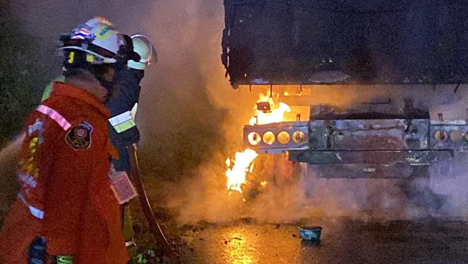 ไฟไหม้ล้อแล้วลุกลามลูกพ่วงวอด กลางถนนเส้นทางสุรินทร์ - กระสัง คนขับโดดลงปลดหัวพ่วงหนีตาย จ.สุรินทร์