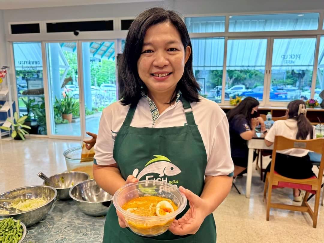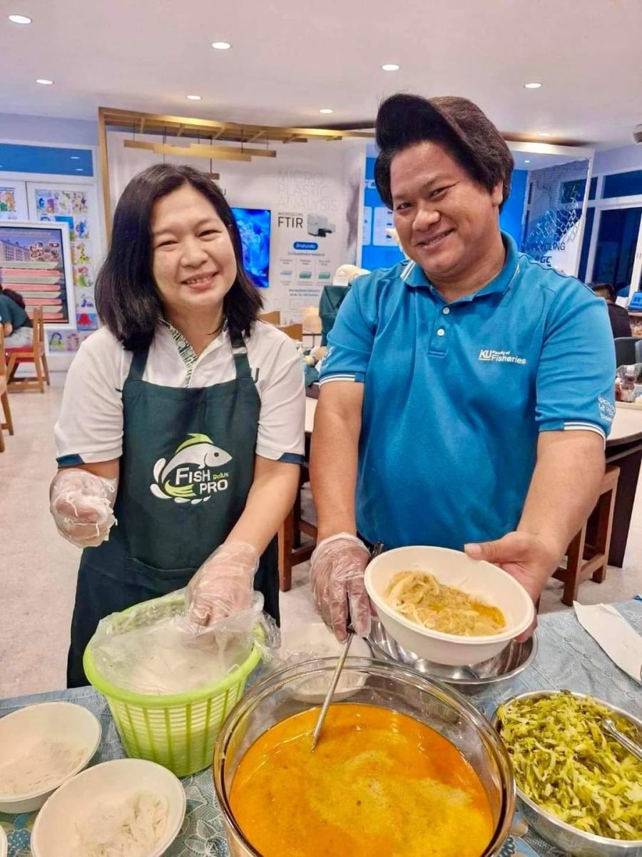 ภาควิชาผลิตภัณฑ์ประมง จัดกิจกรรมชวนชิมเมนูจากปลาหมอคางดำ โดย อ.ดร.สหภพ ดอกแก้ว ภาควิชาเพาะเลี้ยงสัตว์น้ำ ได้นำเสนอหนึ่งใน “เมนูกู้แหล่งน้ำ” นำปลาหมอคางดำมาปรุงเป็นอาหารเมนูคุ้นเคย “ขนมจีนน้ำยาปลาหมอคางดำ” ซึ่งอุดมด้วยสมุนไพรไทยและคุณค่าทางโภชนาการโปรตีนจากเนื้อปลาให้ผู้สนใจได้ทดลองชิม ร่วมกับการบอกเล่าเรื่องราวของปลาหมอคางดำ เพื่อสร้างการรับรู้และความเข้าใจเกี่ยวกับปลาชนิดนี้ให้มากขึ้น ซึ่งเมนูน้ำยาปลาหมอคางดำ ได้รับการตอบรับจากบุคลากร นิสิต และบุคคลทั่วไปเป็นอย่างดี และเสียงสะท้อนส่วนใหญ่บอกว่าก็ไม่ต่างจากน้ำยาปลาปกติ
