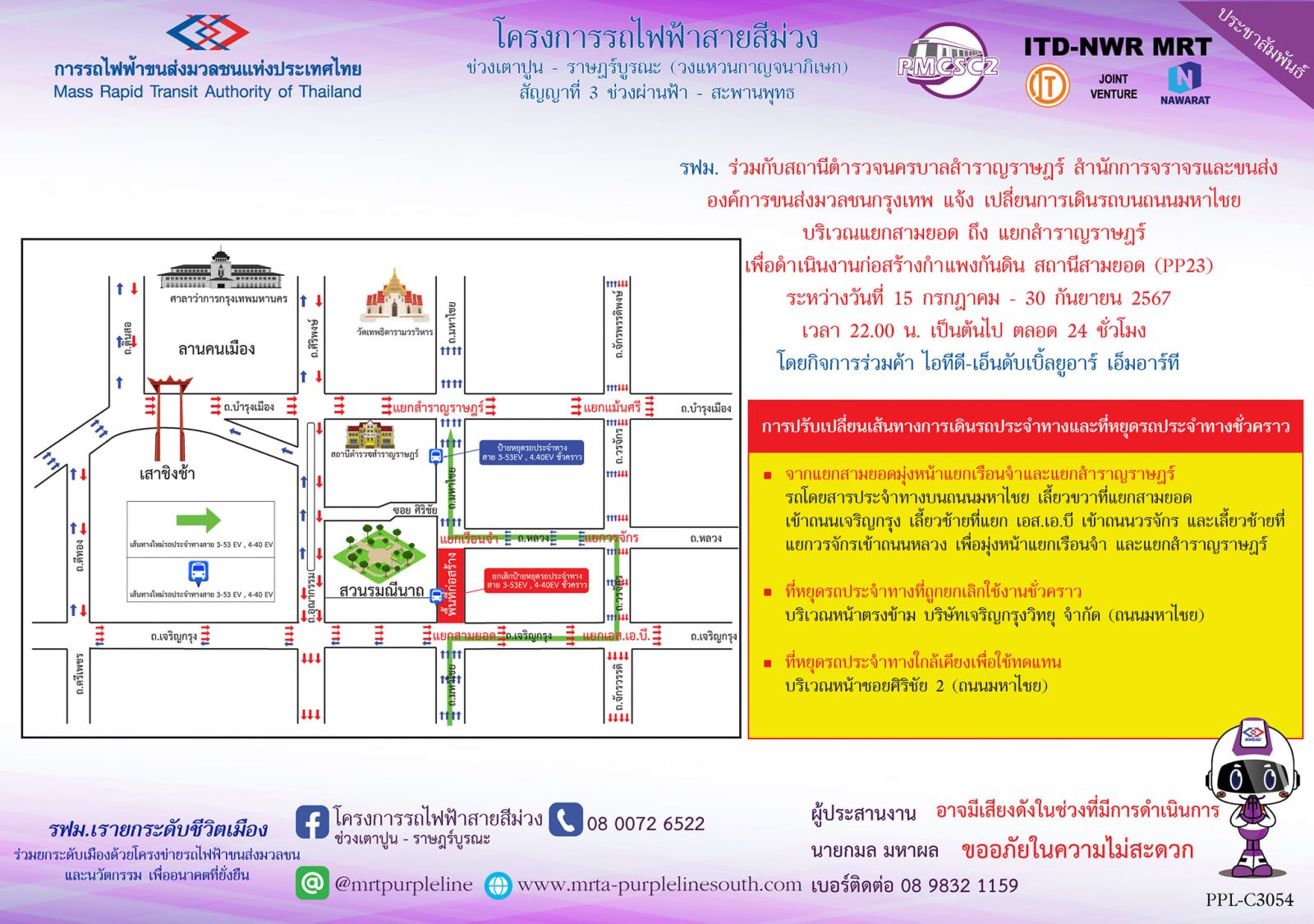 รฟม. ร่วมกับสถานีตำรวจนครบาลสำราญราษฎร์ สำนักการจราจรและขนส่ง และองค์การขนส่งมวลชนกรุงเทพ แจ้งเปลี่ยนการเดินรถบนถนนมหาไชย บริเวณแยกสามยอด ถึง แยกสำราญราษฎร์ เพื่อดำเนินงานก่อสร้างกำแพงกันดิน สถานีสามยอด (PP23) โครงการรถไฟฟ้าสายสีม่วง ช่วงเตาปูน - ราษฎร์บูรณะ (วงแหวนกาญจนาภิเษก) ระหว่างวันที่ 15 กรกฎาคม – 30 กันยายน 2567 เวลา 22.00 น. เป็นต้นไป ตลอด 24 ชั่วโมง