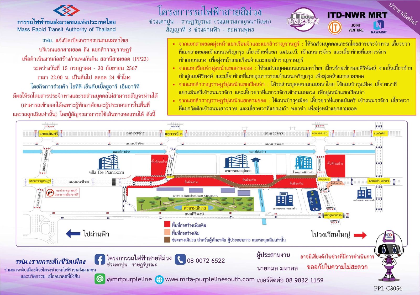 การรถไฟฟ้าขนส่งมวลชนแห่งประเทศไทย (รฟม.) แจ้งว่า กิจการร่วมค้า ไอทีดี-เอ็นดับเบิ้ลยูอาร์ เอ็มอาร์ที ผู้รับจ้างงานออกแบบและก่อสร้างอุโมงค์ทางวิ่งและสถานีใต้ดิน โครงการรถไฟฟ้าสายสีม่วง ช่วงเตาปูน - ราษฎร์บูรณะ (วงแหวนกาญจนาภิเษก) สัญญาที่ 3 ช่วงผ่านฟ้า – สะพานพุทธ มีความจำเป็นต้องเปลี่ยนการเดินรถบนถนนมหาไชย บริเวณแยกสามยอด ถึง แยกสำราญราษฎร์ เพื่อดำเนินงานก่อสร้างกำแพงกันดิน สถานีสามยอด (PP23) ระหว่างวันที่ 15 กรกฎาคม – 30 กันยายน 2567 เวลา 22.00 น. เป็นต้นไป ตลอด 24 ชั่วโมง มีผลให้รถโดยสารประจำทางและรถส่วนบุคคลไม่สามารถสัญจรผ่านได้ (สามารถเข้าออกได้เฉพาะผู้พักอาศัยและผู้ประกอบการในพื้นที่และรถฉุกเฉินเท่านั้น) โดยผู้สัญจรสามารถใช้เส้นทางทดแทนได้ ดังนี้