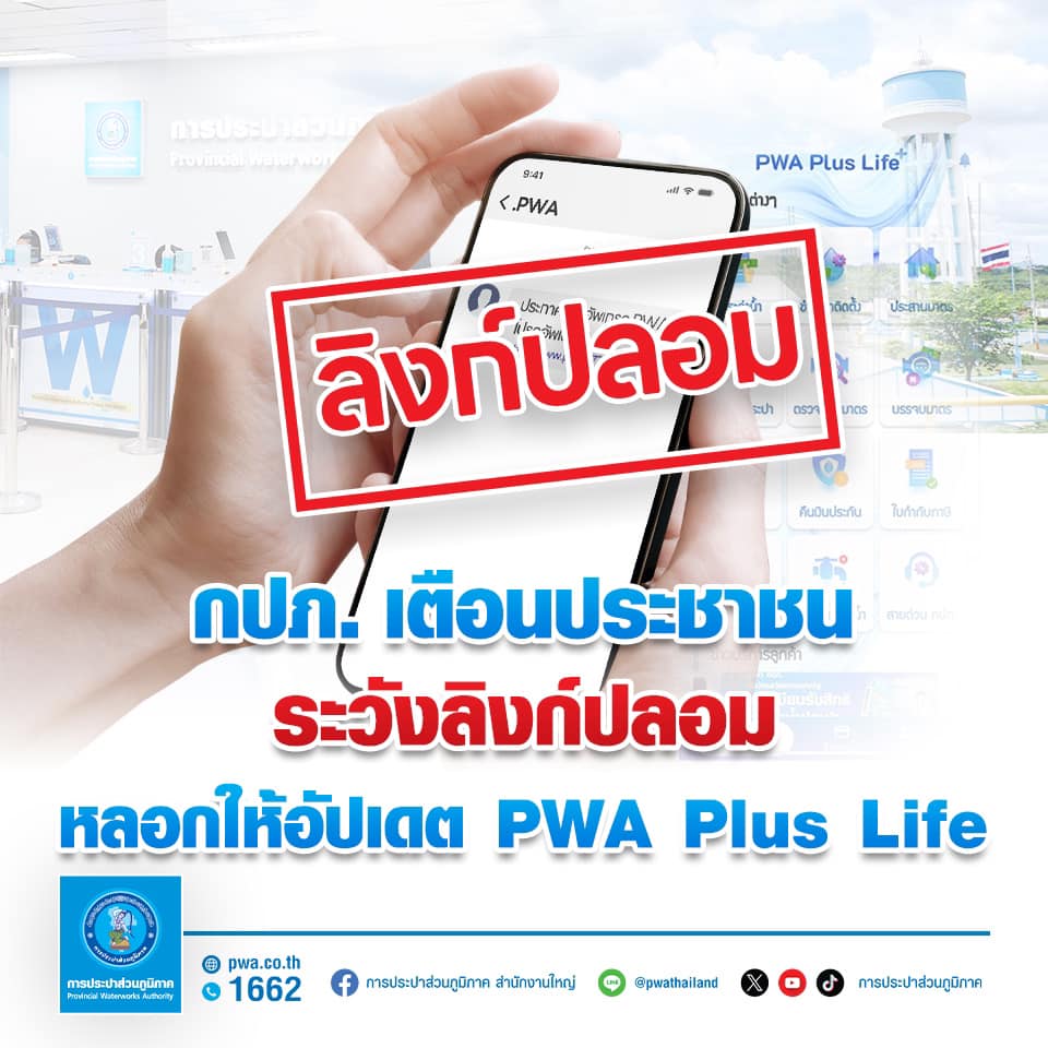 การประปาส่วนภูมิภาค (กปภ.) เตือนประชาชนระวังกลโกงมิจฉาชีพ แอบอ้างเป็น กปภ. หลอกส่ง SMS แจ้งเตือนให้อัปเดตแอปพลิเคชัน PWA Plus Life ด้วยการกดลิงก์ ย้ำ ! กปภ. ไม่มีนโยบายดังกล่าว การอัปเดตแอปพลิเคชันต้องดำเนินการผ่าน App store และ Google play เท่านั้น