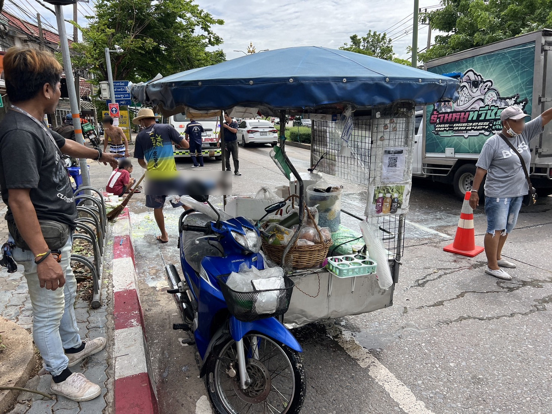 ที่เกิดเหตุพบรถจักรยานยนต์สามล้อพ่วงข้าง ขายลอดช่องสิงคโปร์จอดขวางถนน และมีลอดช่องหกและข้าวของหล่นกระจัดกระจายเกลื่อน ส่วนคนขี่หรือแม่ค้า คือ น.ส.วาสนา อายุ 54 ปี นอนคว่ำหน้าอยู่ที่พื้นถนน จากการสอบถามยังอยู่ในอาการมึนงง บ่นปวดหัวคาดว่าศีรษะจะกระแทกพื้น ทางเจ้าที่กู้ภัยได้ปฐมพยาบาลเบื้องต้นก่อนนำตัวส่งโรงพยาบาลนนทเวช