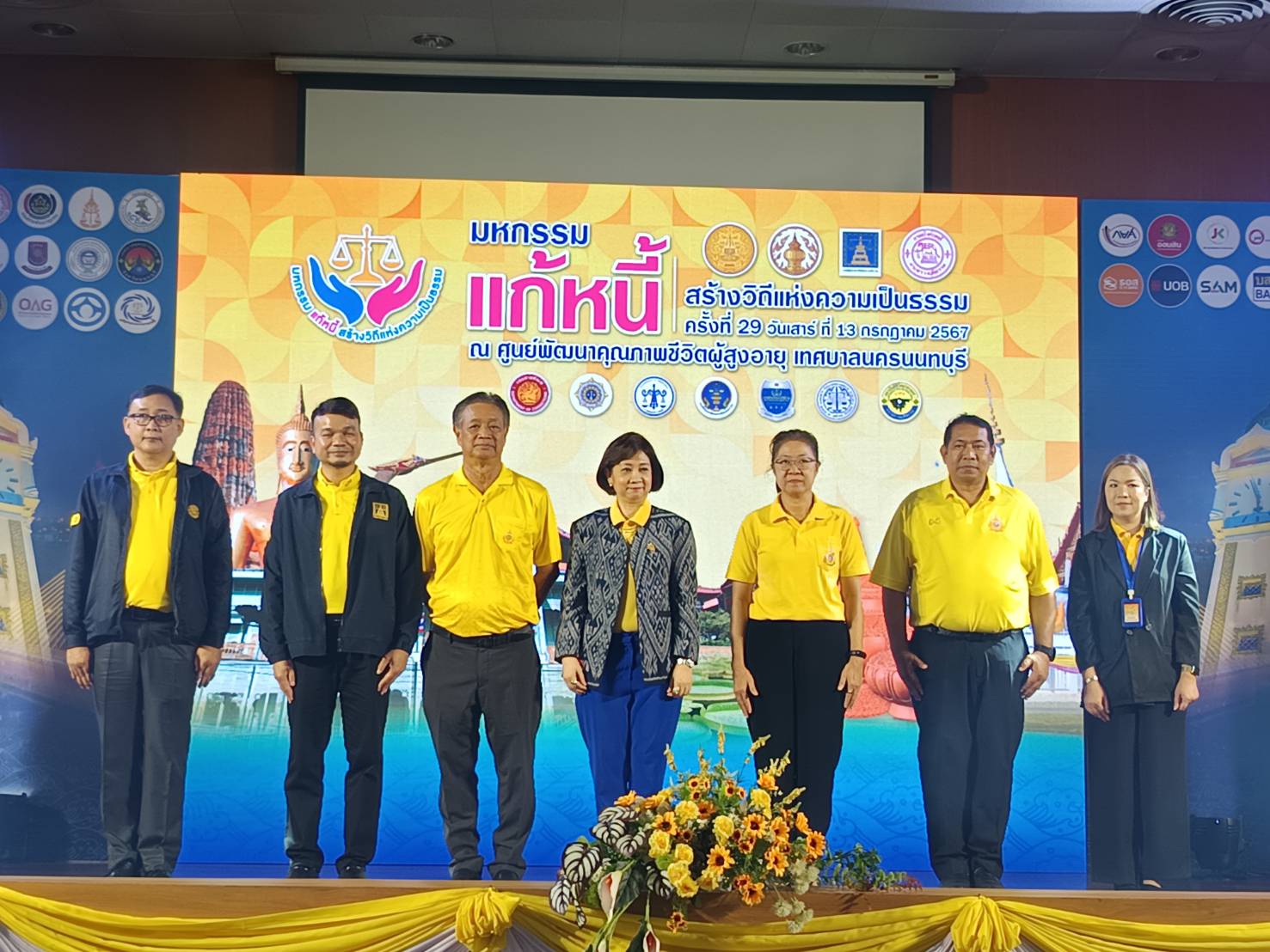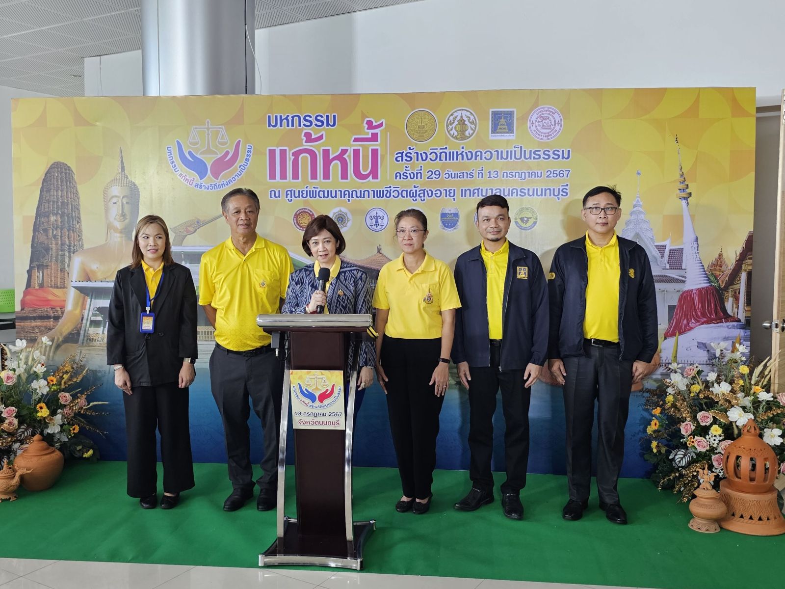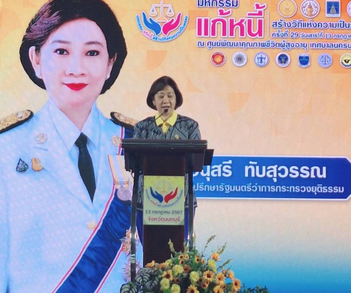 วันที่ 13 กรกฎาคม 2567 นางสาวอนุสรี ทับสุวรรณ คณะที่ปรึกษารัฐมนตรีว่าการกระทรวงยุติธรรม เป็นประธานเปิดงาน"มหกรรมแก้หนี้ สร้างวิถีแห่งความเป็นธรรม" ครั้งที่ 29 จังหวัดนนทบุรี โดยมี นางระวีพรรณ แก้วเพียงเพ็ญ รองผู้ว่าราชการจังหวัดนนทบุรี ร่วมให้การต้อนรับ ณ ศูนย์พัฒนาคุณภาพชีวิตผู้สูงอายุ เทศบาลนครนนทบุรี อำเภอเมือง จังหวัดนนทบุรี