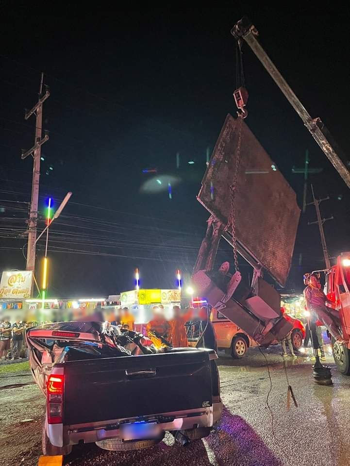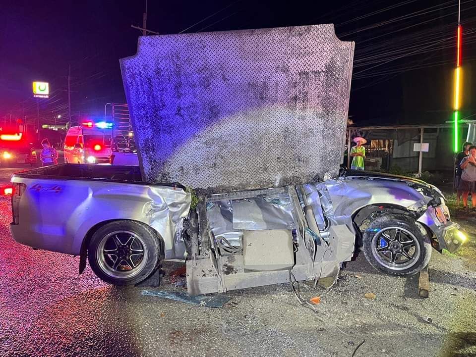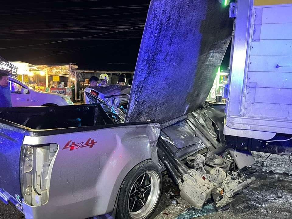 หนุ่มวัย 35 ปีขับรถกระบะเสียหลักฟาดท้ายรถบรรทุก ถาดเหล็กยกสินค้าร่วงทับหลังยุบดับคาซากรถ จ.นครราชสีมา