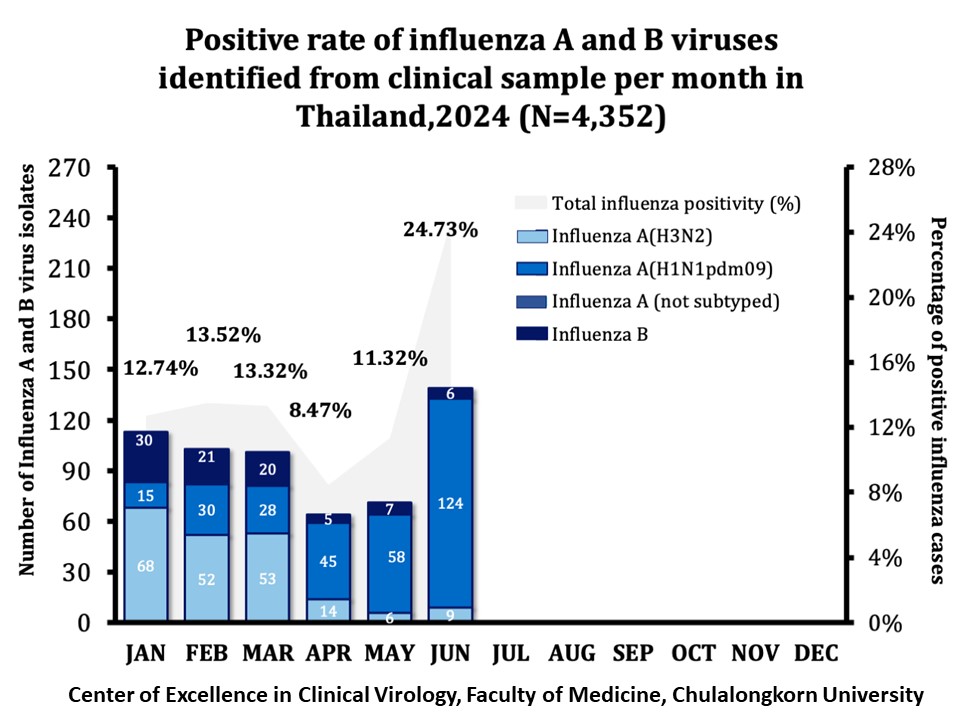 ในปีนี้ไข้หวัดใหญ่พบได้มากมาตั้งแต่ต้นปี หรืออาจกล่าวได้ว่าการระบาดน่าจะพบได้ตลอดทั้งปี แต่จะพบสูงสุดในฤดูฝน เห็นได้ว่าในเดือนมิถุนายนที่ผ่านมา ตรวจตัวอย่างผู้ป่วยเป็นโรคทางเดินหายใจ ตั้งแต่ต้นปีมาจำนวน 4,352 คน