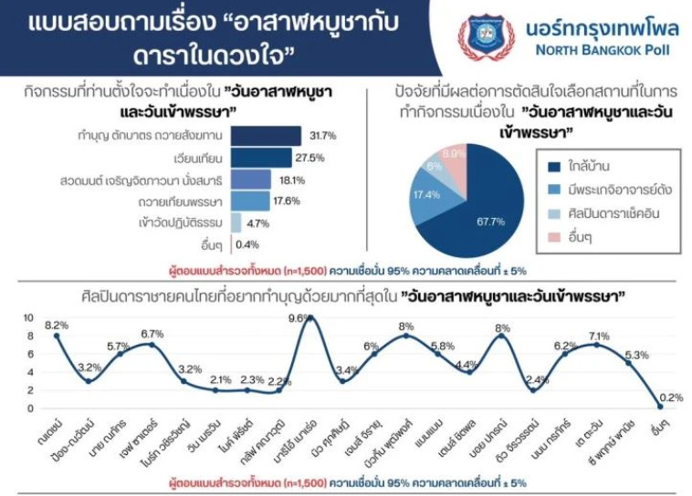 โพล เผย คนไทยอยากทำบุญ วันอาสาฬหบูชากับ "ลิซ่า-มาริโอ้" มากที่สุด ร้อยละ 31.7 ตั้งใจทำกิจกรรมทำบุญ ตักบาตร ถวายสังฆทาน