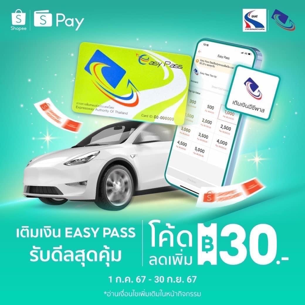 การทางพิเศษแห่งประเทศไทย (กทพ.) กระทรวงคมนาคม จัดโครงการ EXAT x Shopee/ShopeePay "ส่วนลดการเติมเงิน Easy Pass ผ่าน Shopee/ShopeePay" โดย กทพ. ร่วมกับ บริษัท ช้อปปี้เพย์ (ประเทศไทย) จำกัด จัดทำโครงการ EXAT x Shopee/ShopeePay ตั้งแต่วันที่ 1 กรกฎาคม - 30 กันยายน 2567 รับโค้ดส่วนลด 30 บาท เมื่อเติมเงินบัตร Easy Pass จำนวน 1,000 บาท โดยการจัดทำโปรโมชั่นบนแอปพลิเคชัน Shopee/ShopeePay โดยมีเงื่อนไขการรับสิทธิ์ดังนี้