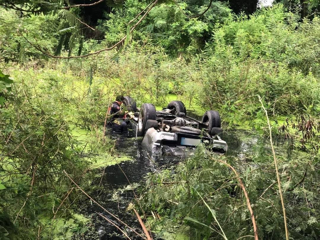 ที่เกิดเหตุ พบรถกระบะ ยี่ห้ออีซูซุ แบบแค๊ป สีเทา ป้ายทะเบียน ชลบุรี ลักษณะพลิกหงายท้องล้อชี้ฟ้าอยู่ในหนองน้ำ ที่รกเต็มไปด้วยวัชพืช ความลึกของน้ำระดับคอ ตรวจสอบภายในพบผู้เสียชีวิตเป็นผู้ชาย 1 รายอยู่บริเวณเบาะนั่งคนขับ เจ้าหน้าที่กู้ภัยจึงช่วยกันนำร่างผู้เสียชีวิตขึ้นมาบนฝั่ง