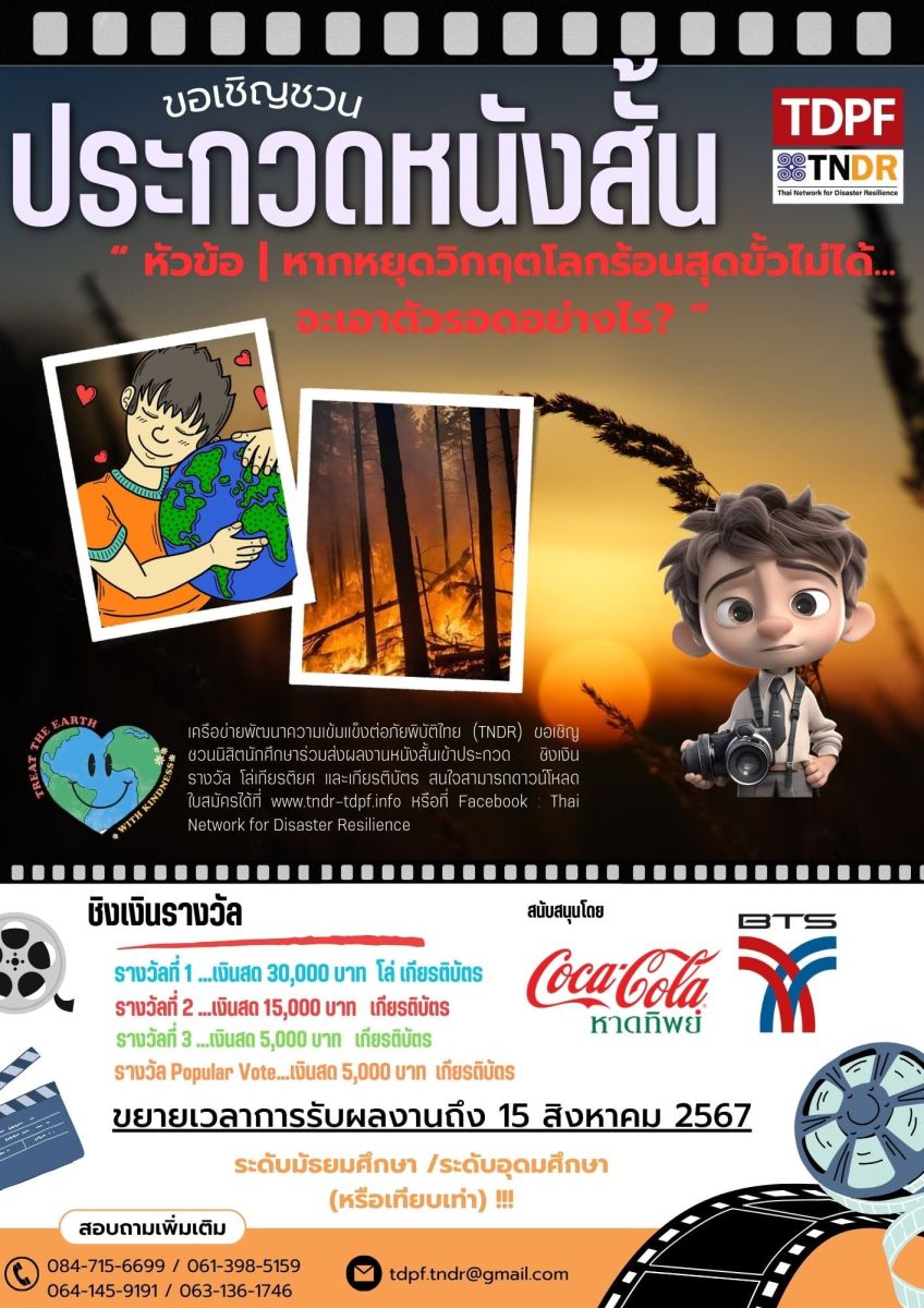 วันนี้ (18 ก.ค.67) เครือข่ายพัฒนาความเข้มแข็งต่อภัยพิบัติไทย (Thai Network for Disaster Resilience : TNDR) ภายใต้การดำเนินงานของมูลนิธิเตรียมความพร้อมป้องกันภัยพิบัติในประเทศไทย (Thai Disaster Preparedness Foundation : TDPF) จัดประกวดหนังสั้น ภายใต้หัวข้อ “หากหยุดวิกฤตโลกร้อนสุดขั้วไม่ได้......จะเอาตัวรอดอย่างไร?” โดยมีวัตถุประสงค์เพื่อเสริมสร้างการตระหนักรู้เกี่ยวกับภัยจากการเปลี่ยนแปลงสภาพภูมิอากาศ (Climate Change) รวมถึงการส่งเสริม สนับสนุนการมีส่วนร่วมในการรณรงค์ต่อต้านการกระทำที่ส่งผลต่อการเปลี่ยนแปลงสภาพภูมิอากาศ ตลอดจนการเอาตัวรอดจากวิกฤตดังกล่าว ชิงเงินรางวัลกว่า 50,000 บาท พร้อมโล่ และเกียรติบัตร